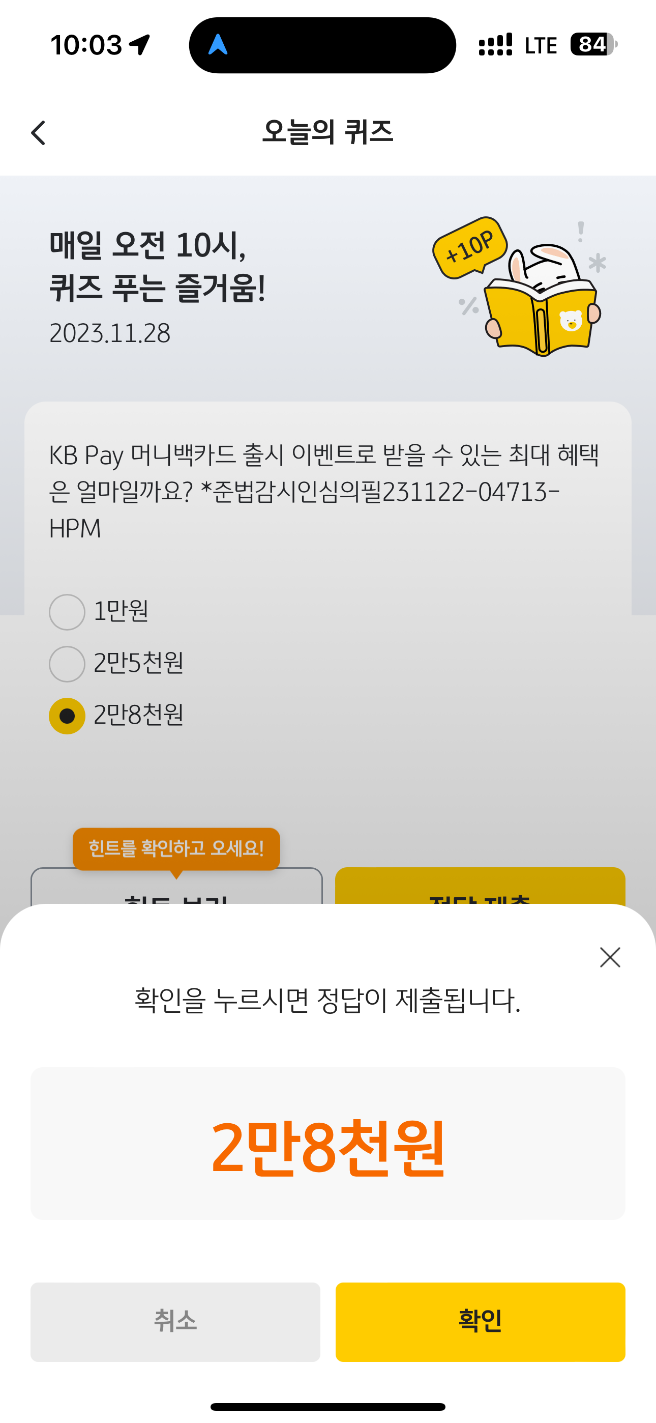 KB Pay 오늘의 퀴즈 정답은 2만8천원 입니다