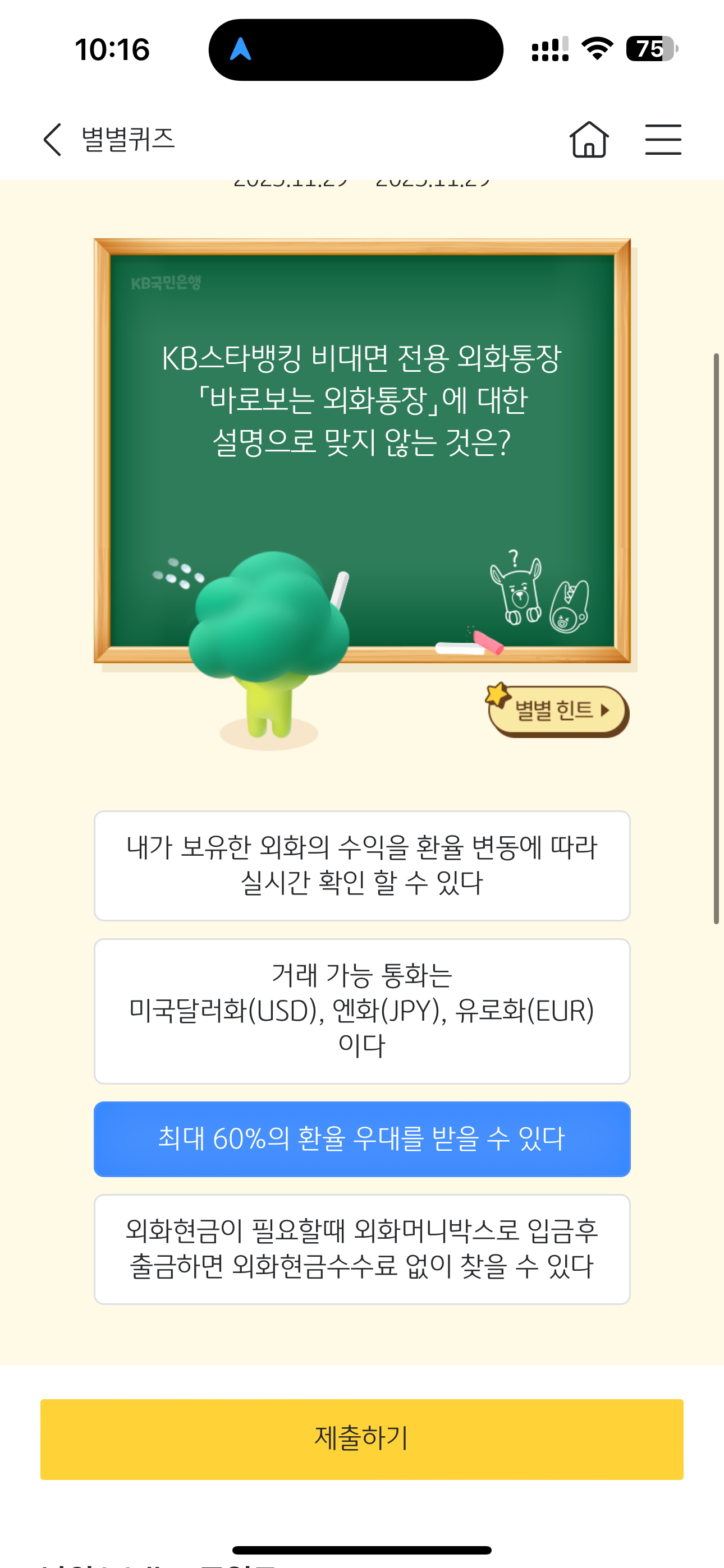 KB스타뱅킹 별별퀴즈 정답은 최대 60%의 환율 우대를 받을 수 있다