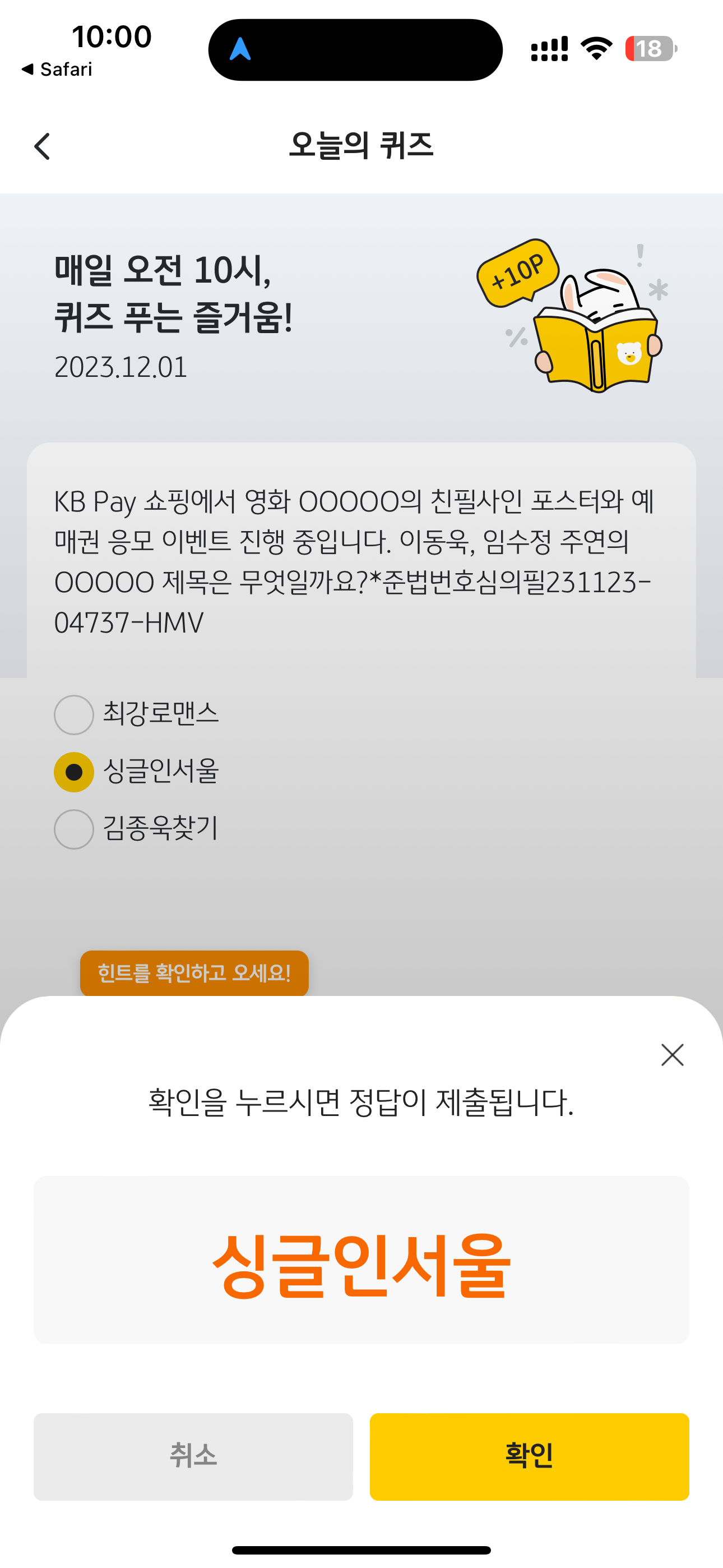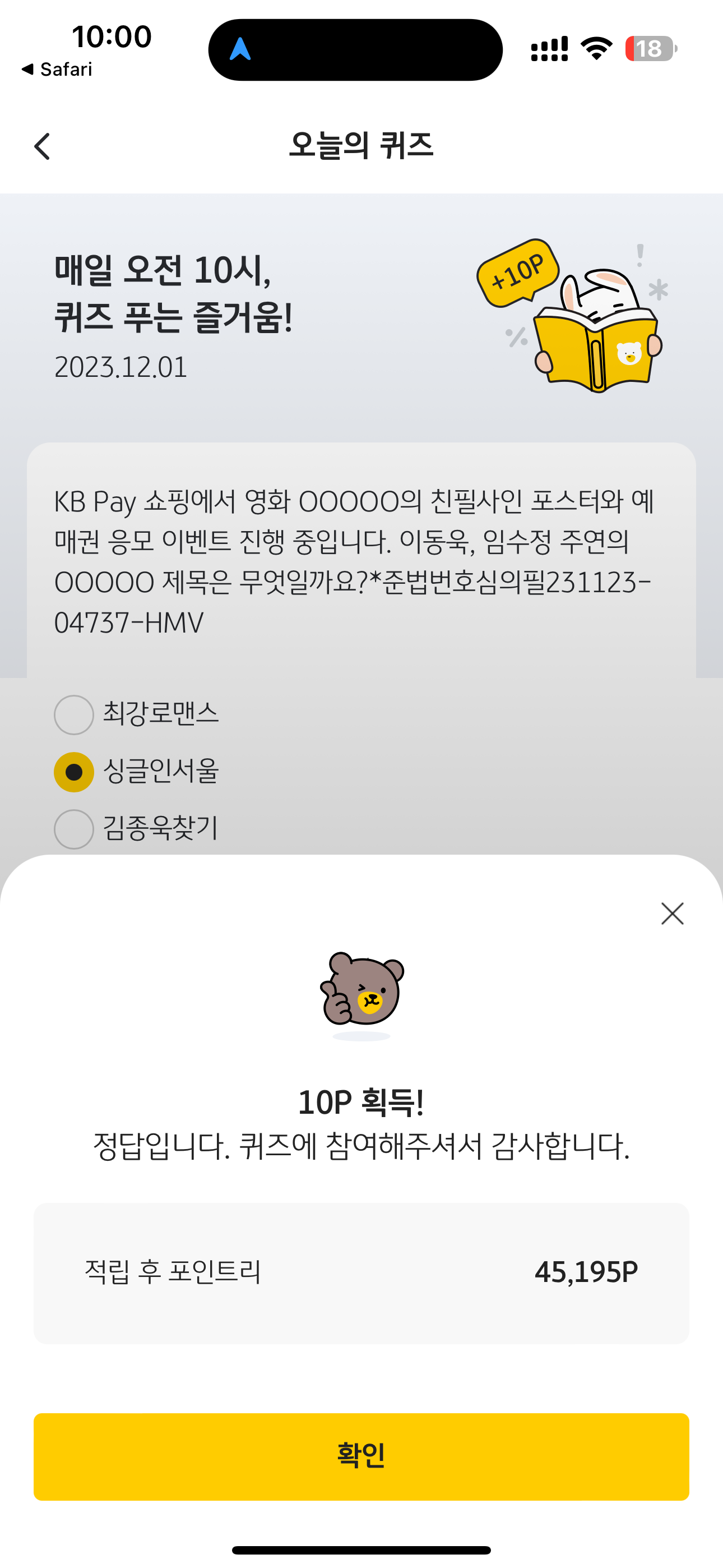 KB Pay 오늘의 퀴즈 정답은 싱글인서울 입니다