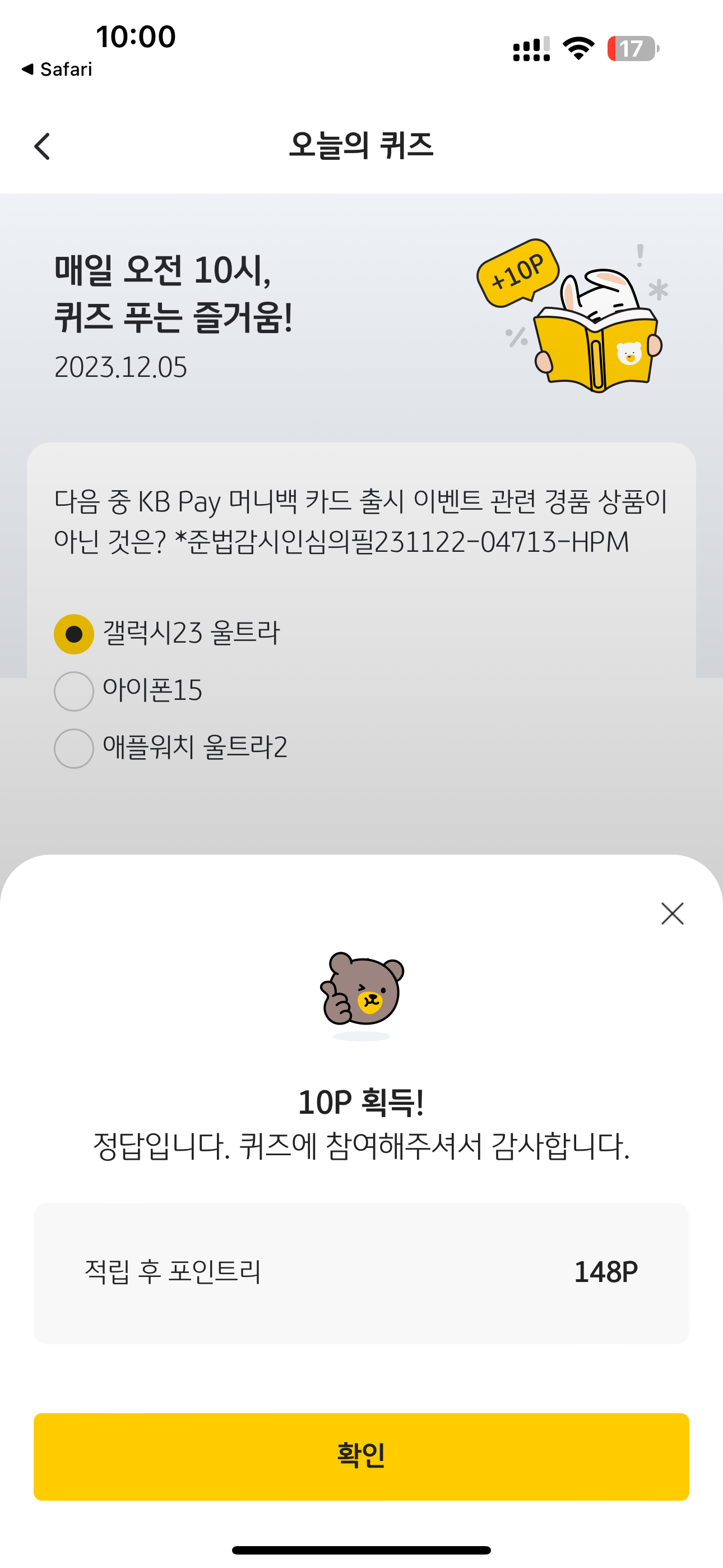 KB Pay 오늘의 퀴즈 정답은 갤럭시23 울트라 입니다