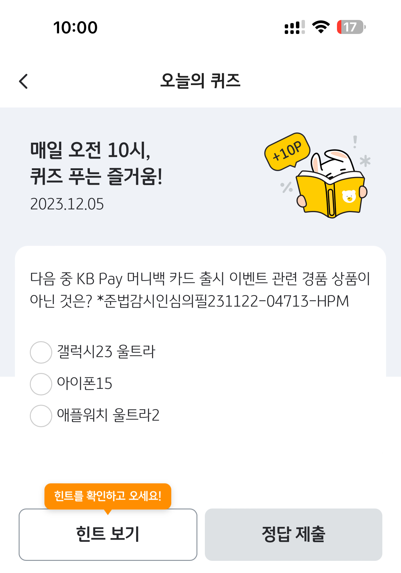 다음 중 KB Pay 머니백 카드 출시 이벤트 관련 경품 상품이 아닌 것은? *준법감시인심의필231122-04713-HPM 보기는 1. 갤럭시23 울트라 2. 아이폰15 3. 애플워치 울트라2 입니다. 요즘 학생들이 많이 좋아하는 제품이죠. 그리고 정답이 아닌 것은 제품 이름도 틀리게 해두었네요.