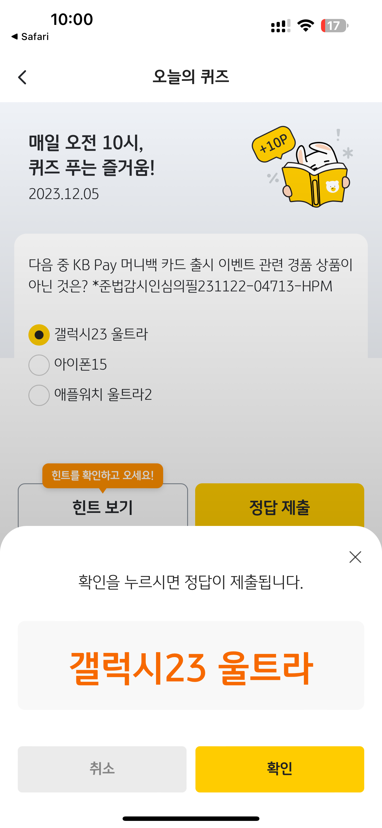 KB Pay 오늘의 퀴즈 정답은 갤럭시23 울트라 입니다