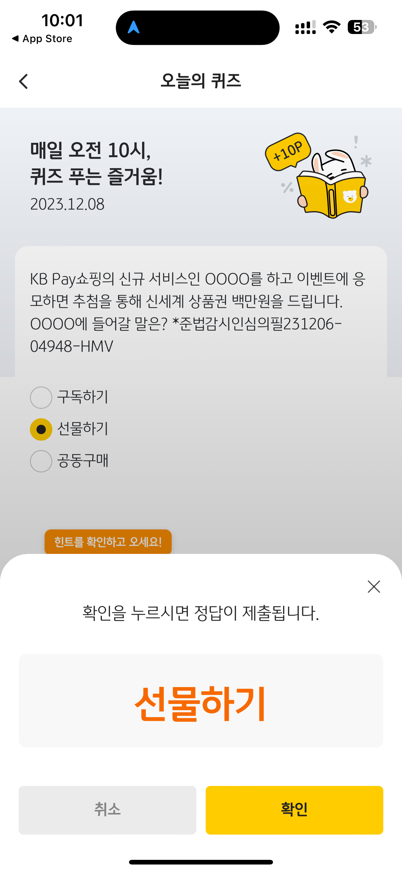 KB Pay 오늘의 퀴즈 정답은 선물하기 입니다