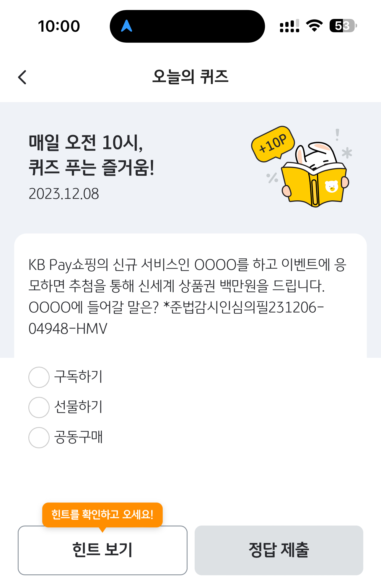 KB Pay쇼핑의 신규 서비스인 OOOO를 하고 이벤트에 응모하면 추첨을 통해 신세계 상품권 백만원을 드립니다. OOOO에 들어갈 말은? *준법감시인심의필231206-04948-HMV 보기는 1. 구독하기 2. 선물하기 3. 공동구매 입니다. 연말을 맞아 가장 많이 하는 거죠