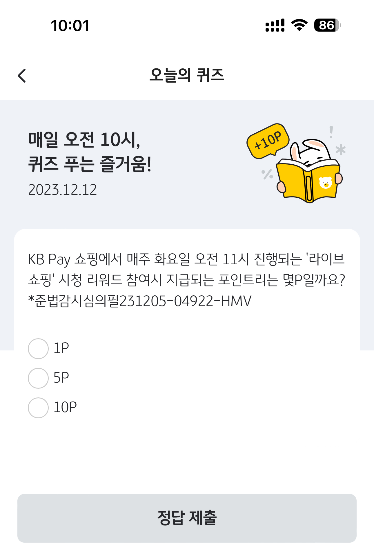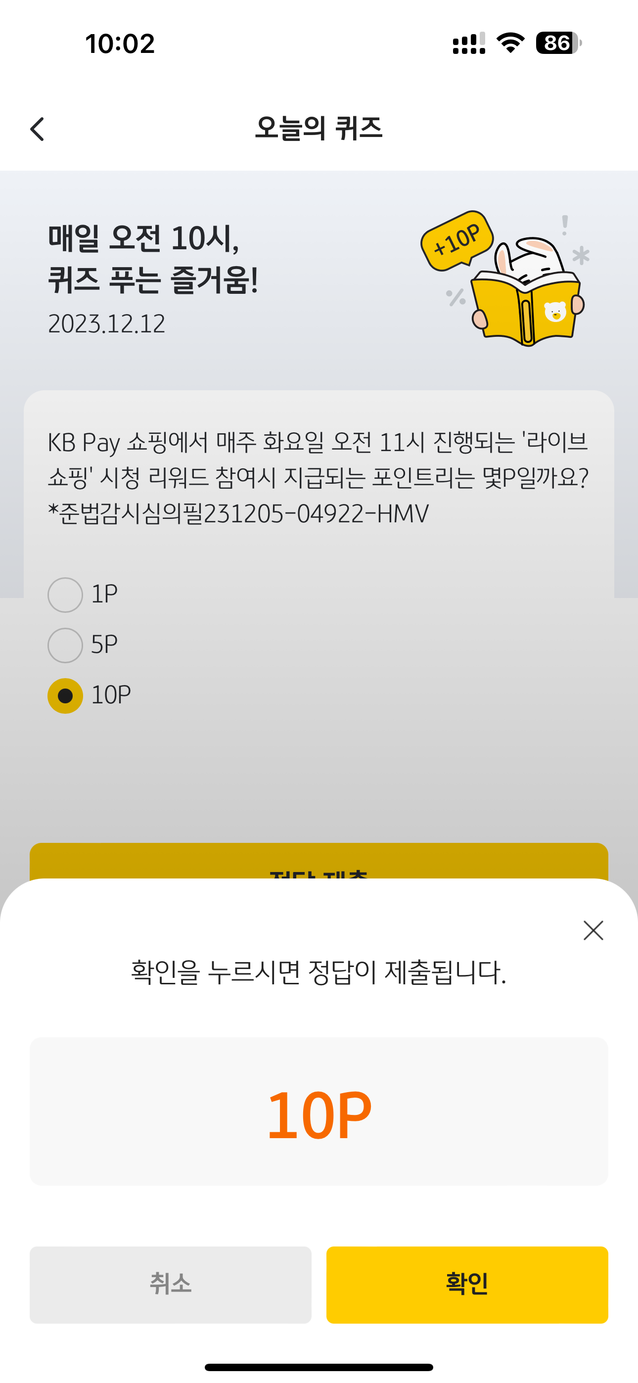 KB Pay 오늘의 퀴즈 정답은 10P 입니다