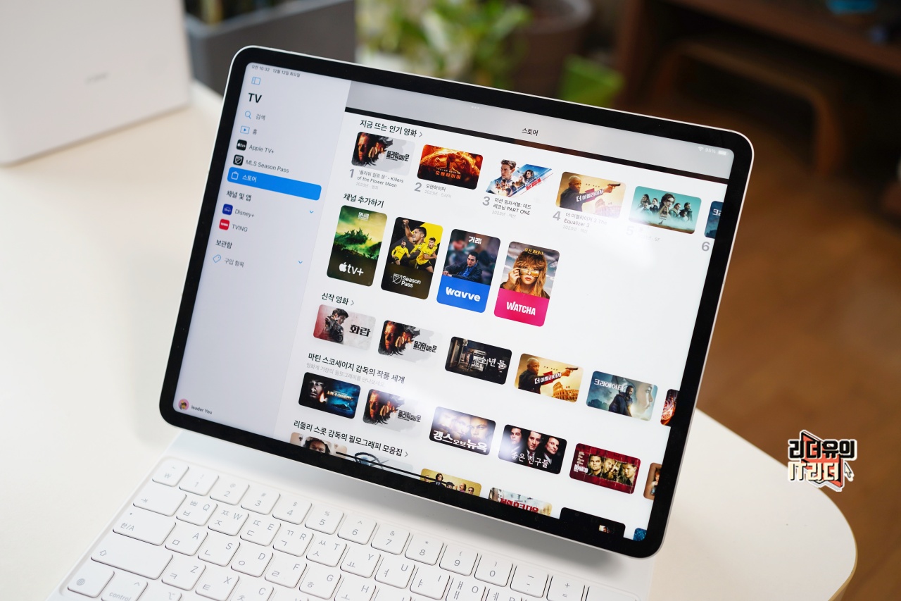 애플 TV 앱을 실행하면 왼쪽에 메뉴바가 생긴 것을 볼 수 있습니다. 애플TV+(Apple TV+), MLS Season Pass(메이저리그 축구), 스토어, 보관함으로 메뉴의 접근성이 개선되었습니다. 메이저리그 축구 중계를 애플이 독점 중계하고 있는데요. 이에 대한 접근성을 높인 변화라 할 수 있습니다. 그리고 홈 메뉴의 큐레이션도 새로운 변화를 만날 수 있습니다. 최신 공개작, 인기 콘텐츠, 지금 뜨는 영화, 나를 위한 추천 등 맞춤 콘텐츠를 볼 수 있습니다.