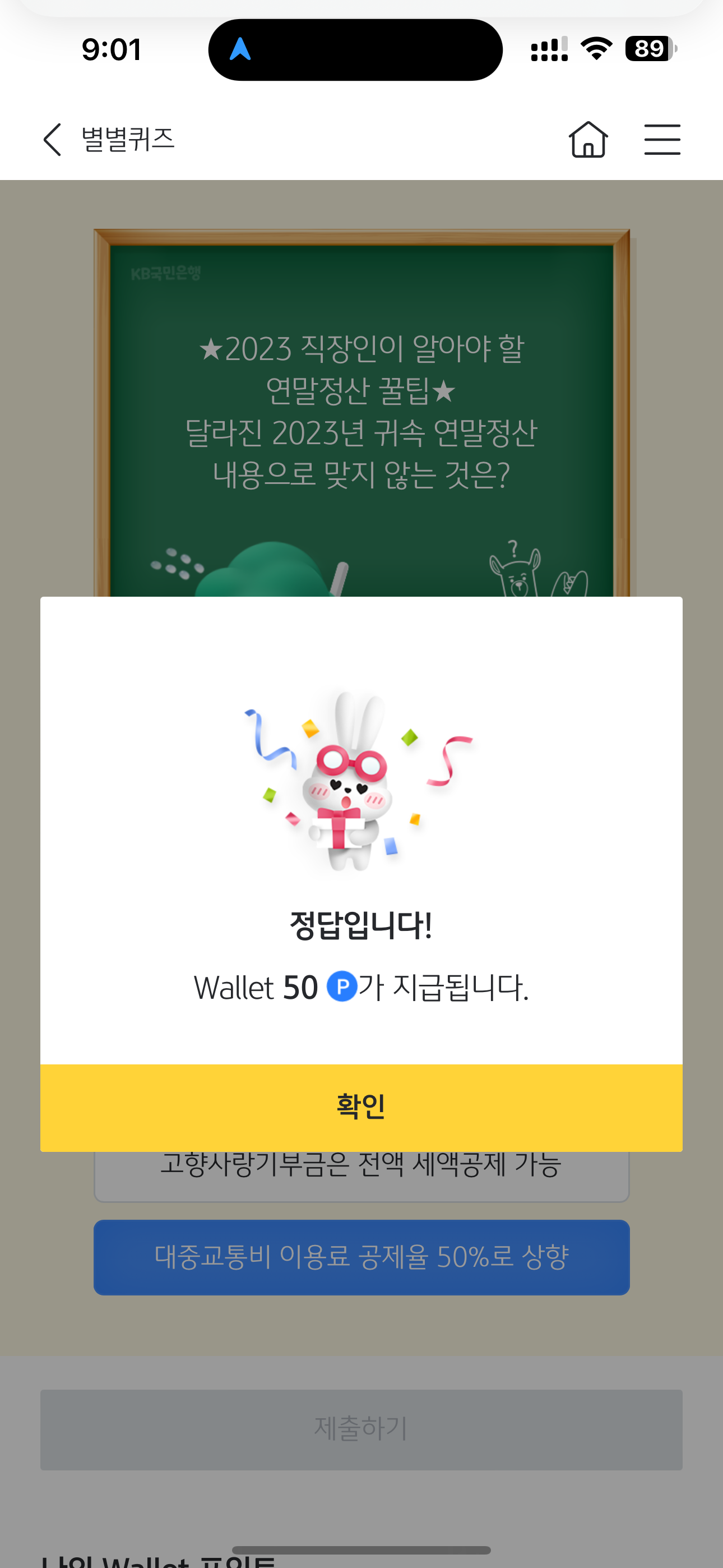 KB스타뱅킹 별별퀴즈 정답은 대중교통비 이용료 공제율 50%로 상향 입니다