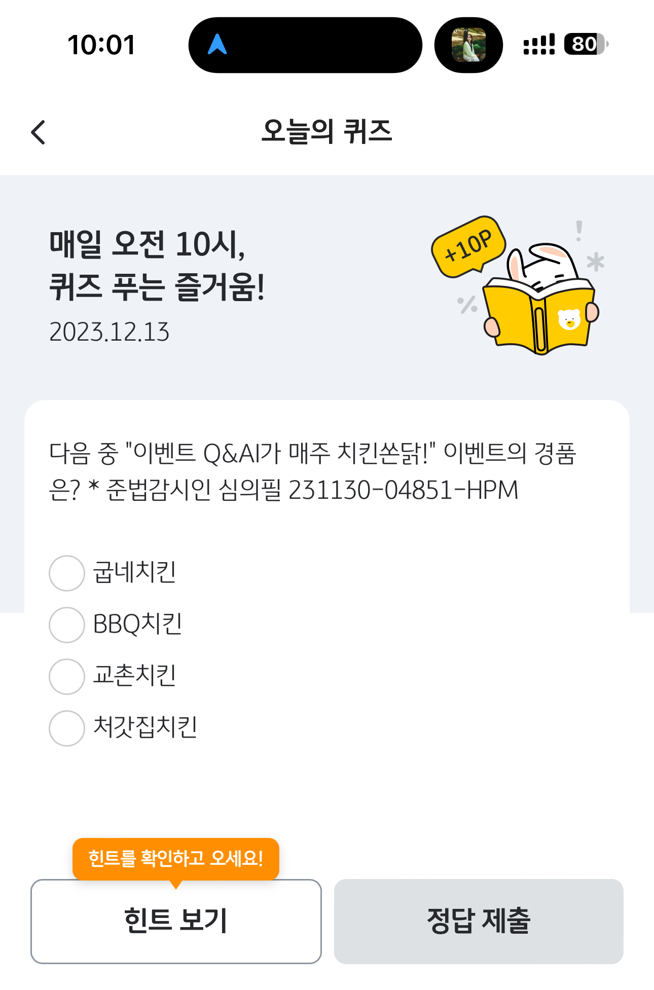 KB Pay 오늘의 퀴즈 정답은 BBQ치킨 입니다