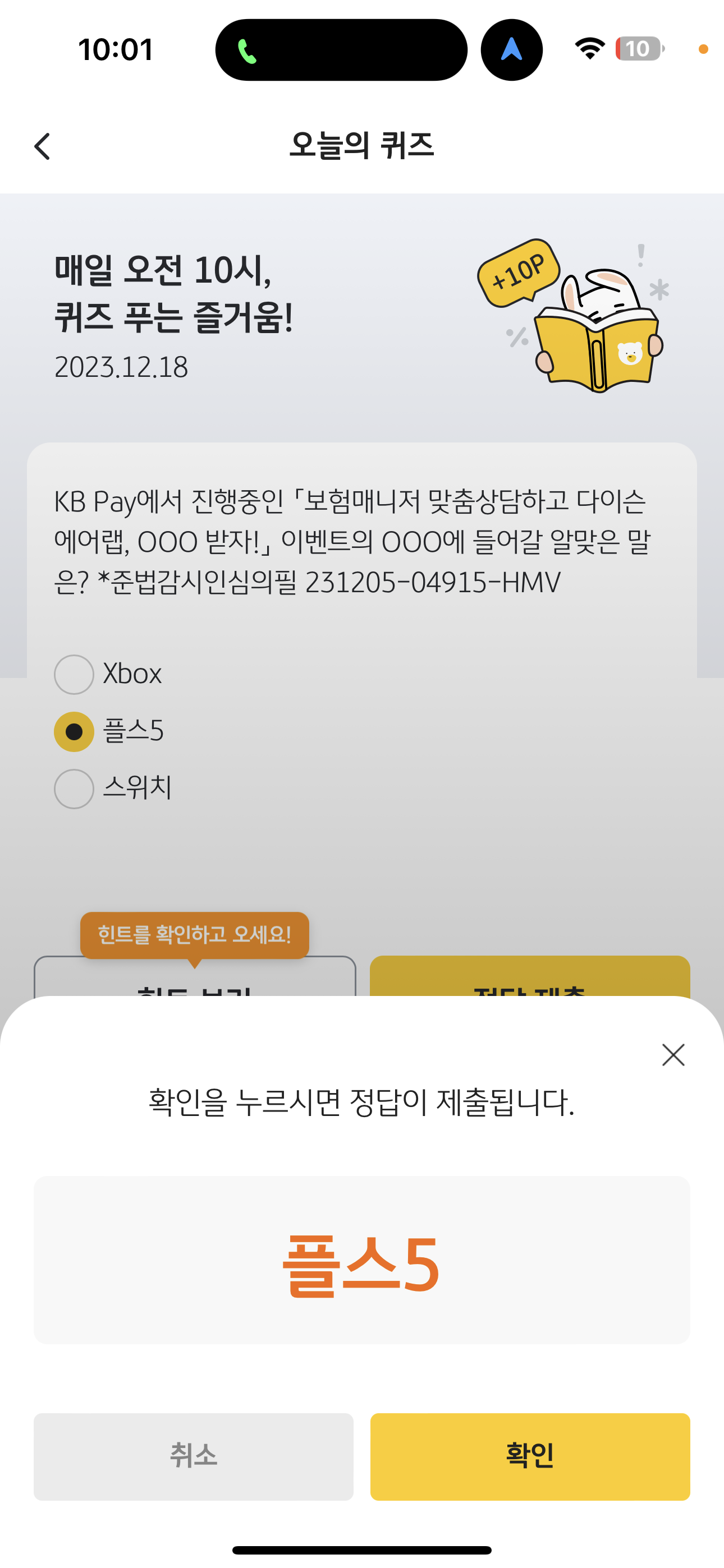 KB Pay에서 진행중인 「보험매니저 맞춤상담하고 다이슨 에어랩, OOO 받자!」 이벤트의 OOO에 들어갈 알맞은 말은? *준법감시인심의필 231205-04915-HMV 보기는 1. Xbox 2. 플스5 3. 스위치 입니다.