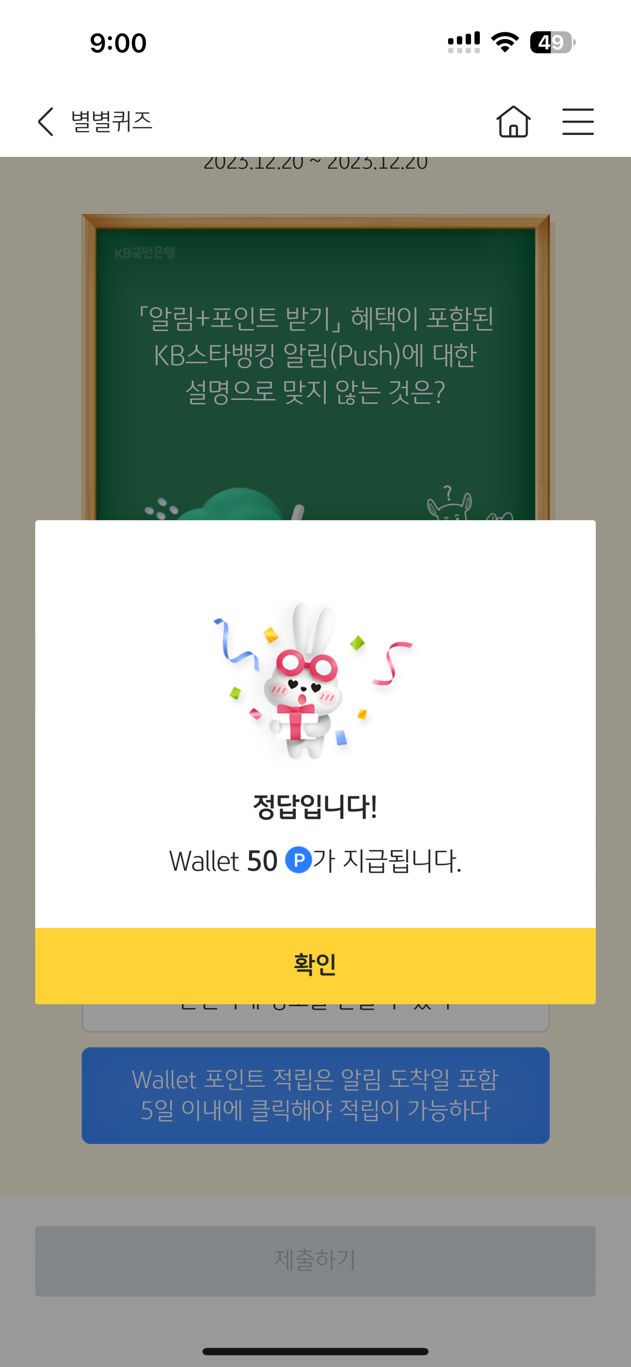KB스타뱅킹 별별퀴즈 정답은 Wallet 포인트 적립은 알림 도착일 포함 5일 이내에 클릭해야 적립이 가능하다 입니다