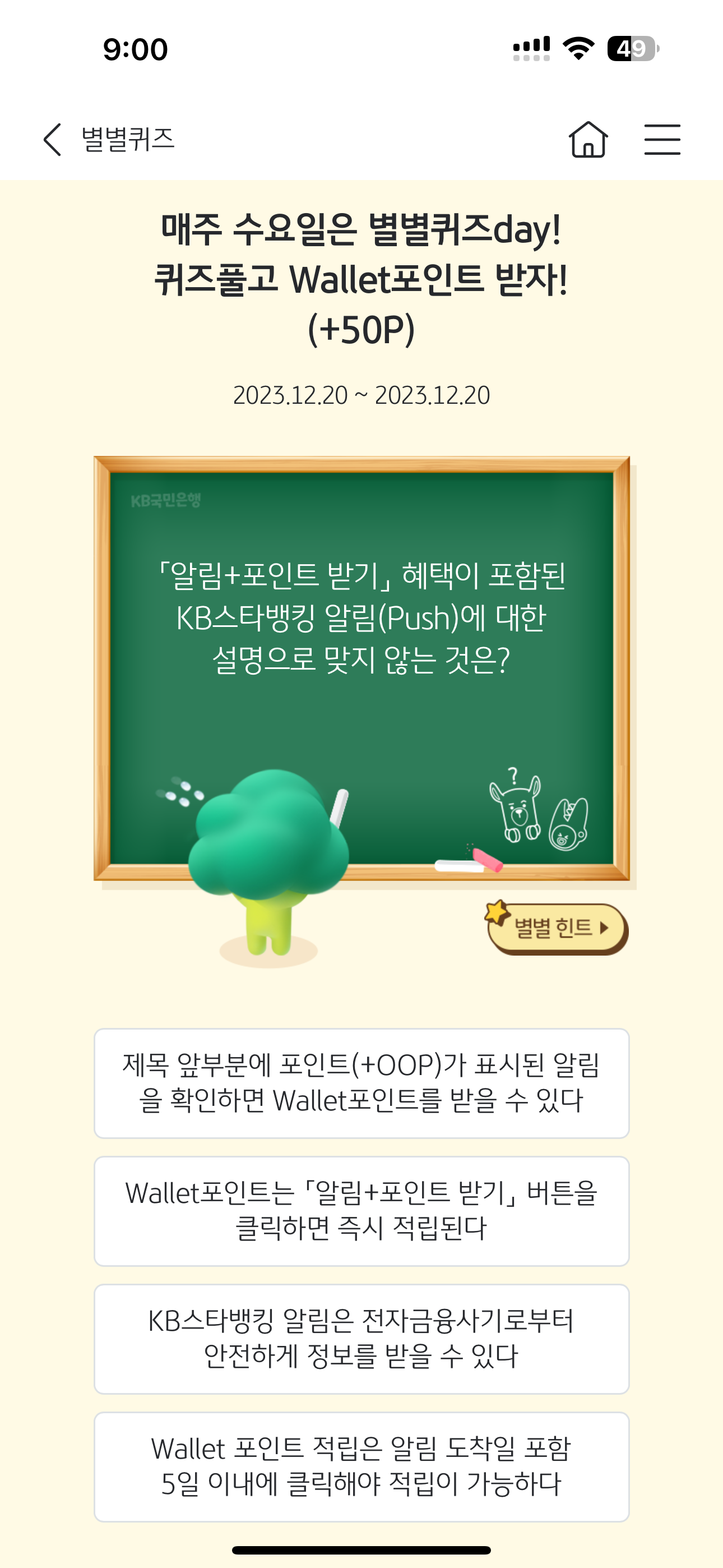 KB스타뱅킹 별별퀴즈 정답은 Wallet 포인트 적립은 알림 도착일 포함 5일 이내에 클릭해야 적립이 가능하다 입니다