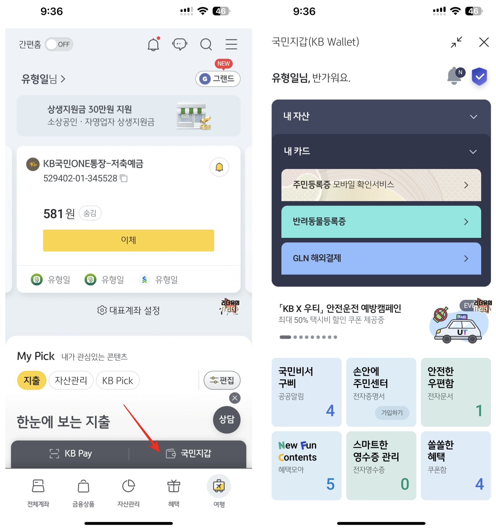 KB스타뱅킹 앱으로 들어가서 하단에 보면 국민지갑 메뉴가 있습니다. 국민지갑이 KB Wallet 서비스입니다.