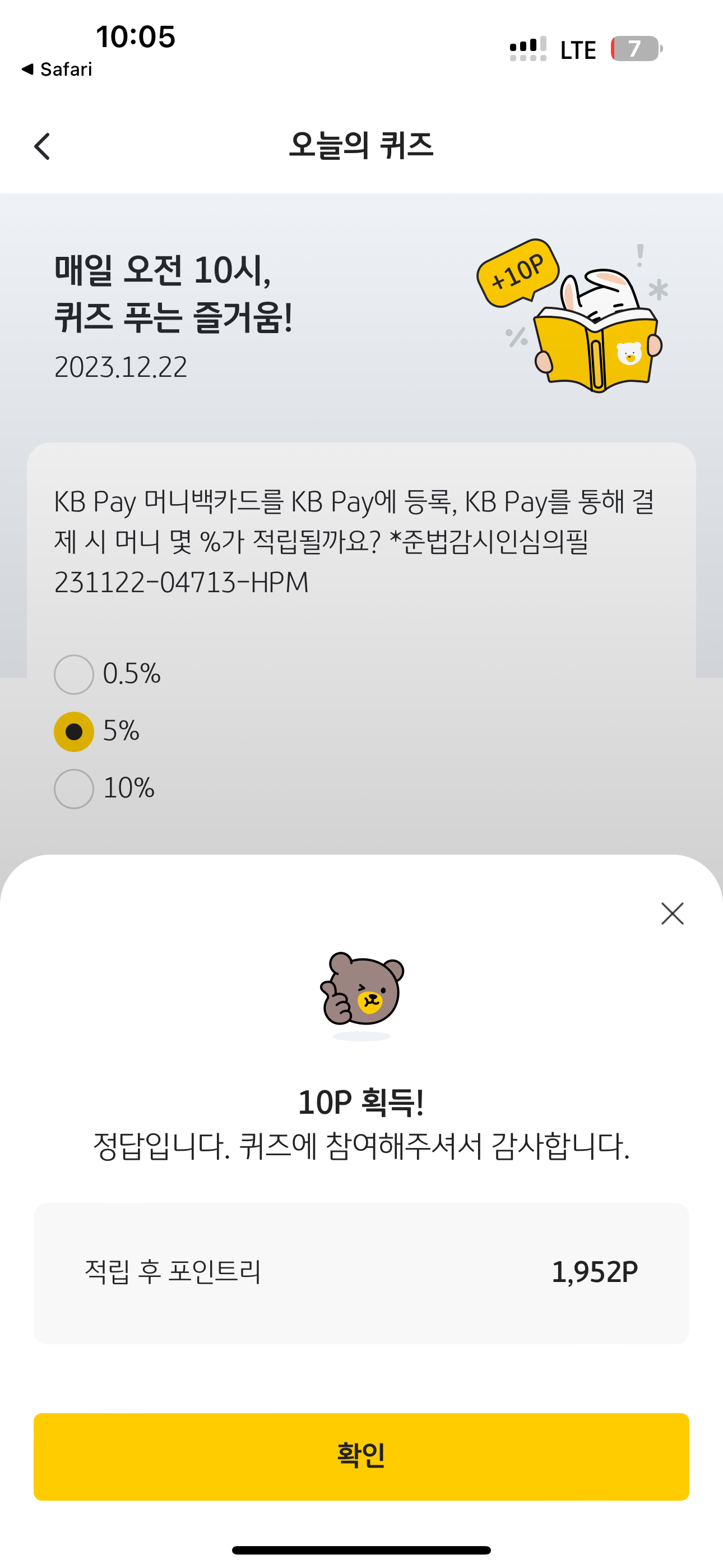 KB Pay 오늘의 퀴즈 정답은 5% 입니다