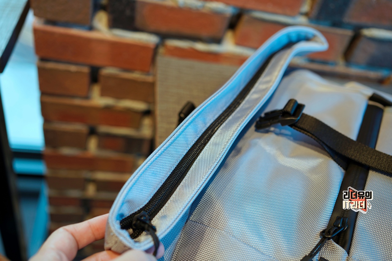 그리고 등판 위쪽에 보면 지퍼가 있어 노트북이나 태블릿PC를 빠르게 꺼낼 수 있게 되어 있습니다. 이 부부느이 지퍼도 방수처리가 되어 있어 비가 올때도 안전하게 휴대할 수 있습니다.