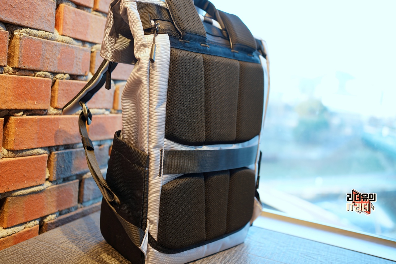 등판 영역은 도틈한 패드 처리가 되어 있어 착용감이 좋고 내부 물건과도 바로 밀착이 안되기 때문에 안전한 휴대를 할 수 있습니다.