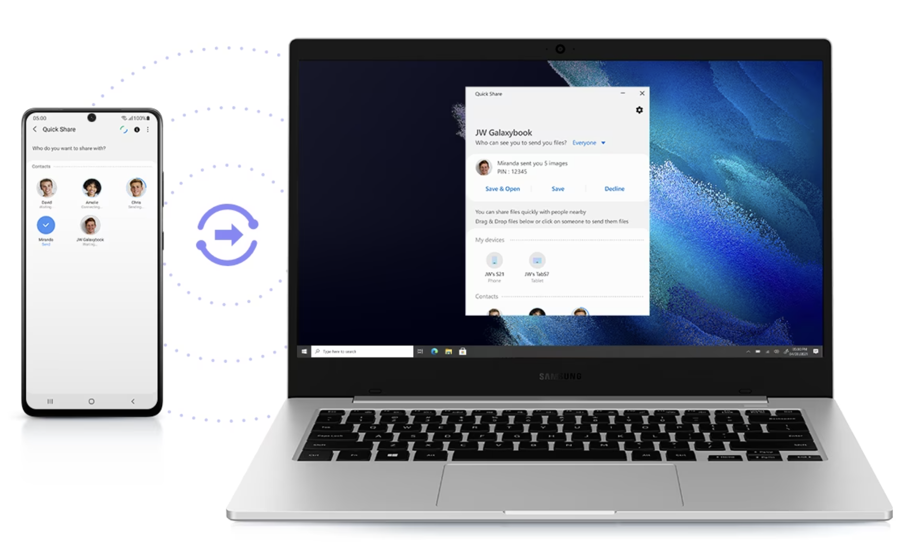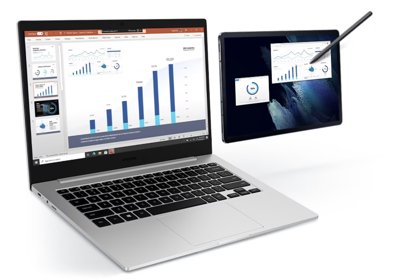 갤럭시북3 Go 5G는 삼성 모바일 제품과의 연결성에 신경을 쓰고 나왔습니다. PC의 키보드와 마우스를 태블릿과 스마트폰에서 쓸 수 있는 멀티 컨트롤을 지원하고 PC와 태블릿을 연결해 듀얼 모니터 사용을 할 수 있는 세컨드 스크린 지원, 갤럭시 기기 간 파일 공유가 가능한 퀵쉐어 기능 등 최적의 갤럭시 에코 시스템을 지원합니다.
