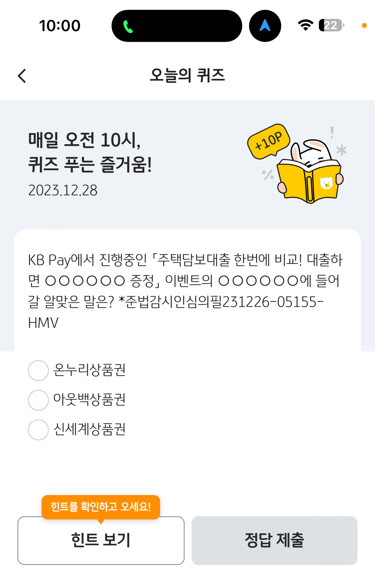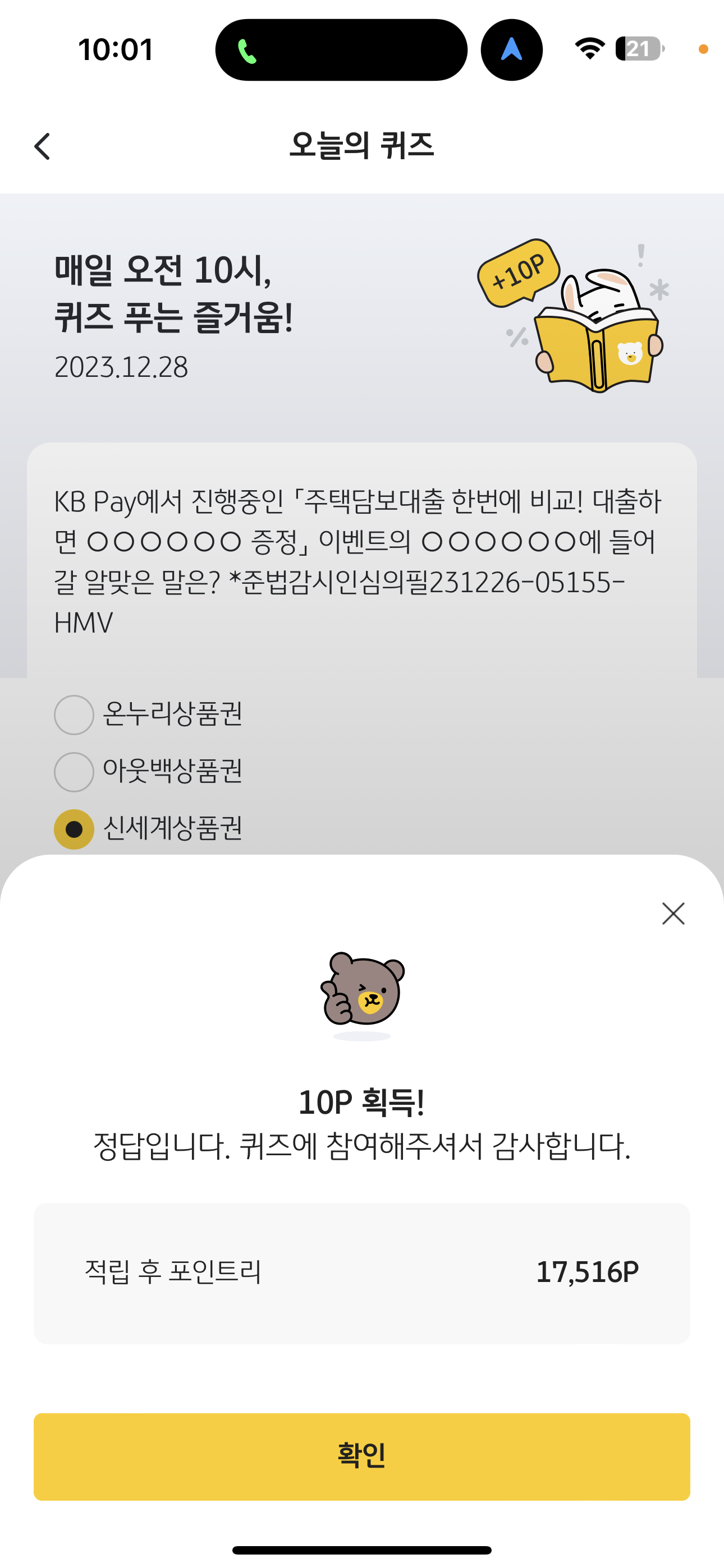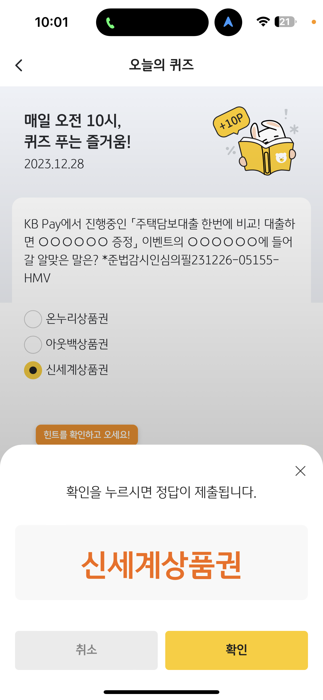 KB Pay 오늘의 퀴즈 정답은 신세계상품권 입니다