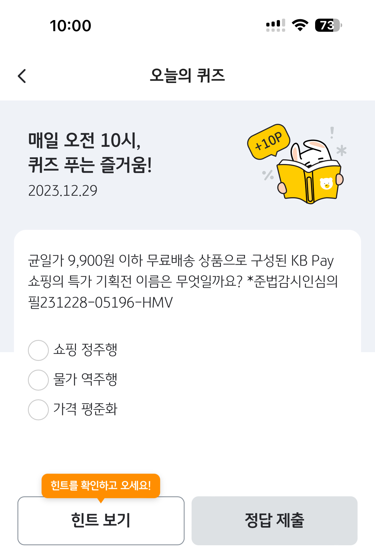균일가 9,900원 이하 무료배송 상품으로 구성된 KB Pay 쇼핑의 특가 기획전 이름은 무엇일까요? *준법감시인심의필231228-05196-HMV 보기는 1. 쇼핑 정주행 2. 물가 역주행 3. 가격 평준화 입니다. 요즘은 특가 행사 잘 이용하면 저렴하게 구입할 수 있죠. 물가 안정화에 큰 기여를 하는 이벤트 입니다.