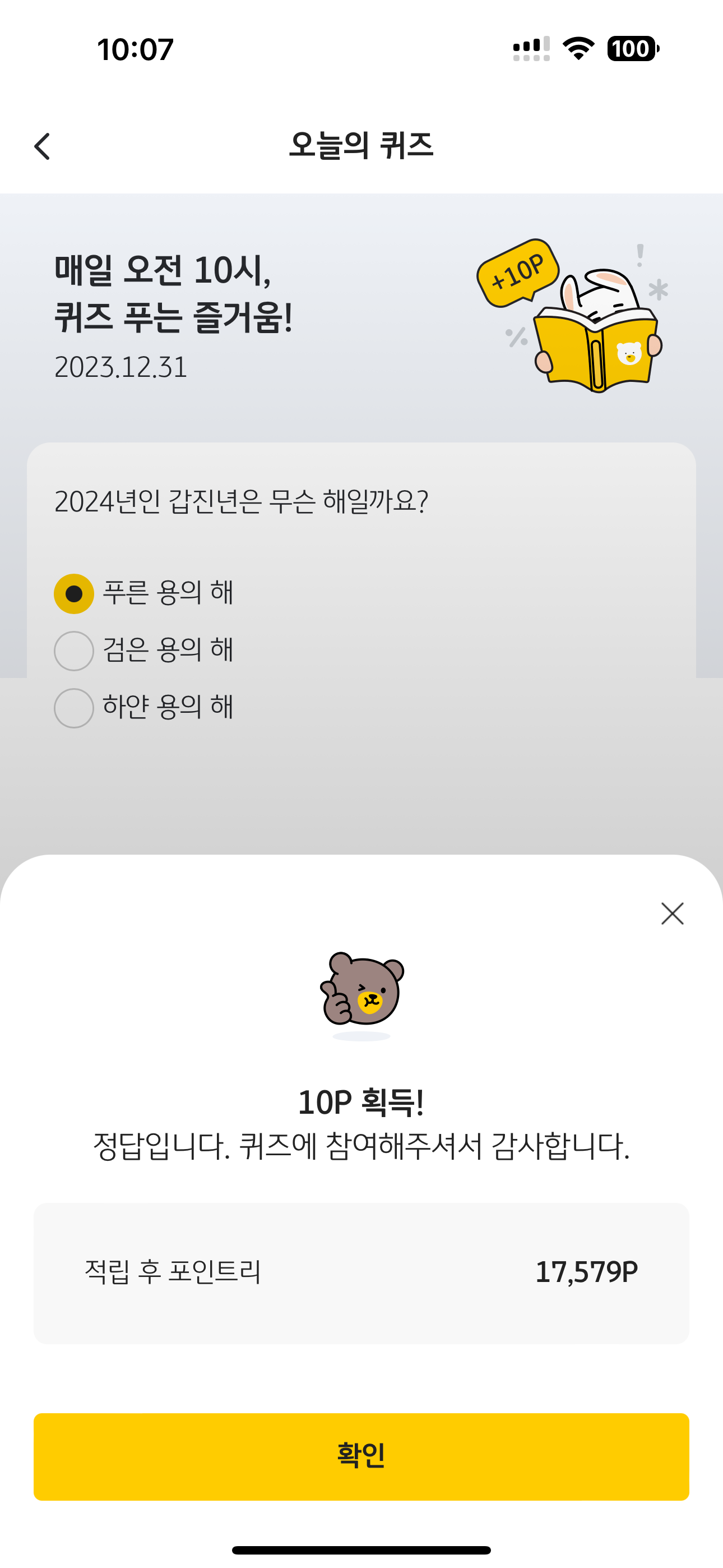 KB Pay 오늘의 퀴즈 정답은 푸른 용의 해 입니다