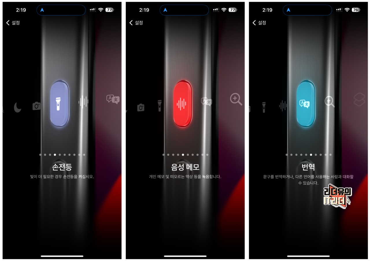아이폰15 프로(아이폰15 Pro), 아이폰15 프로 맥스(아이폰15 Pro Max) 는 기존 진동 스위치가 사라지고 버튼식 동작 버튼이 들어갔습니다. 동작 버튼을 길게 눌러 기능을 실행하게 한 것인데요. 그래서 자신이 사용할 기능을 동작 버튼에 배치해 사용하면 됩니다.