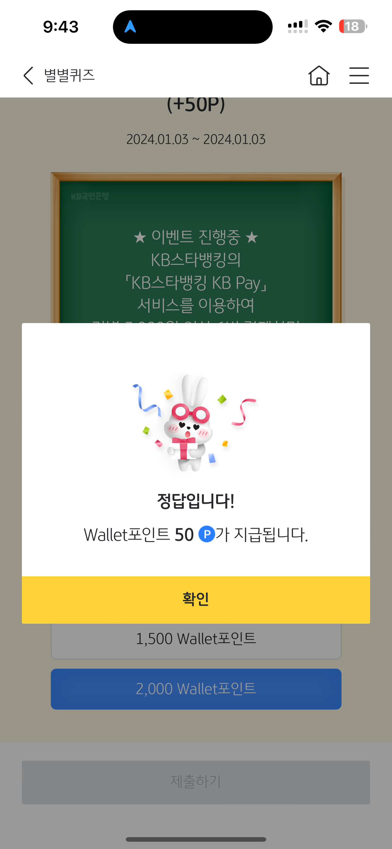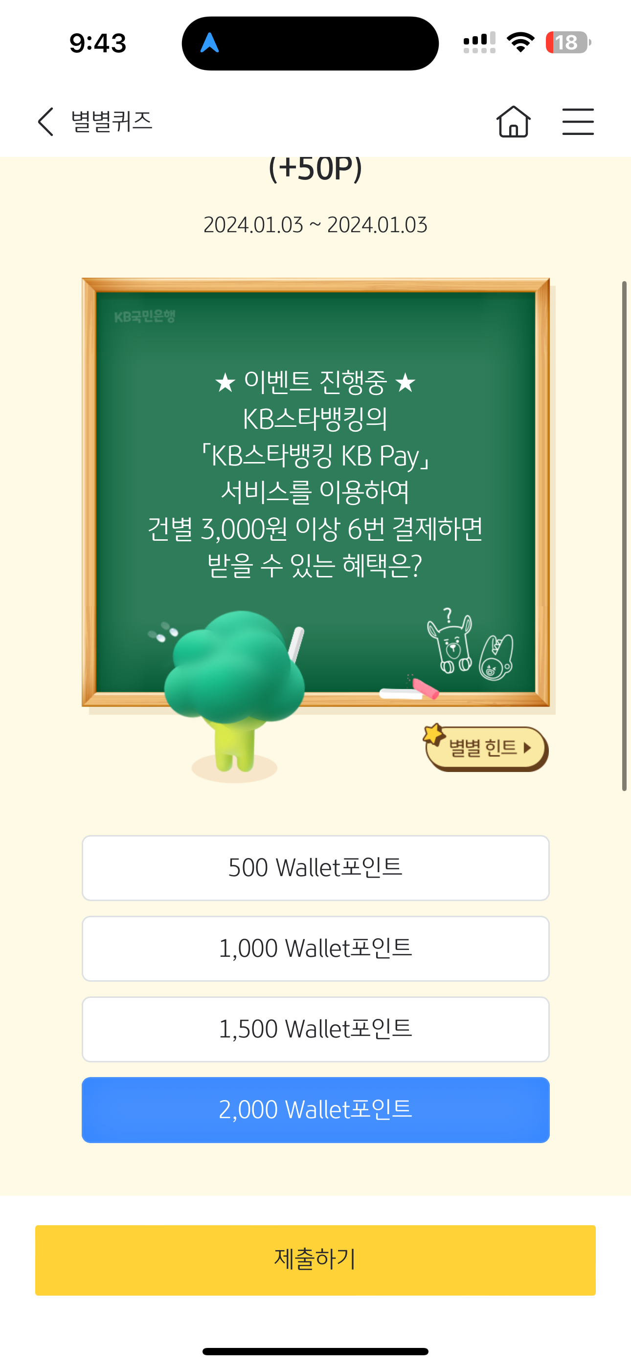 KB스타뱅킹 별별퀴즈 정답은 2,000 Wallet포인트 입니다.