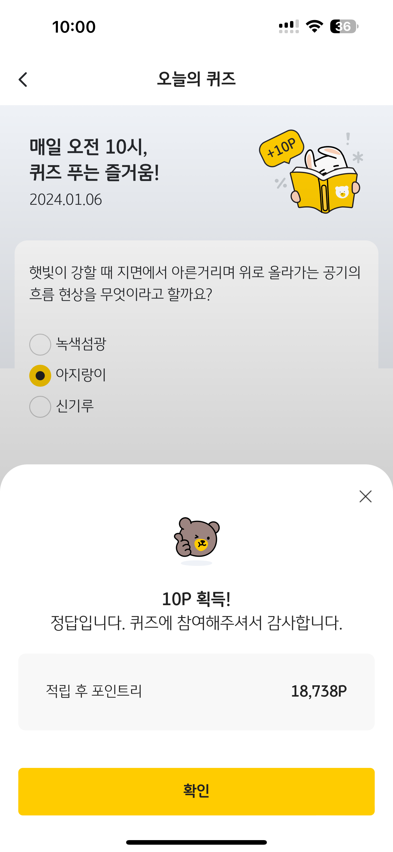 KB Pay 오늘의 퀴즈 정답은 아지랑이 입니다