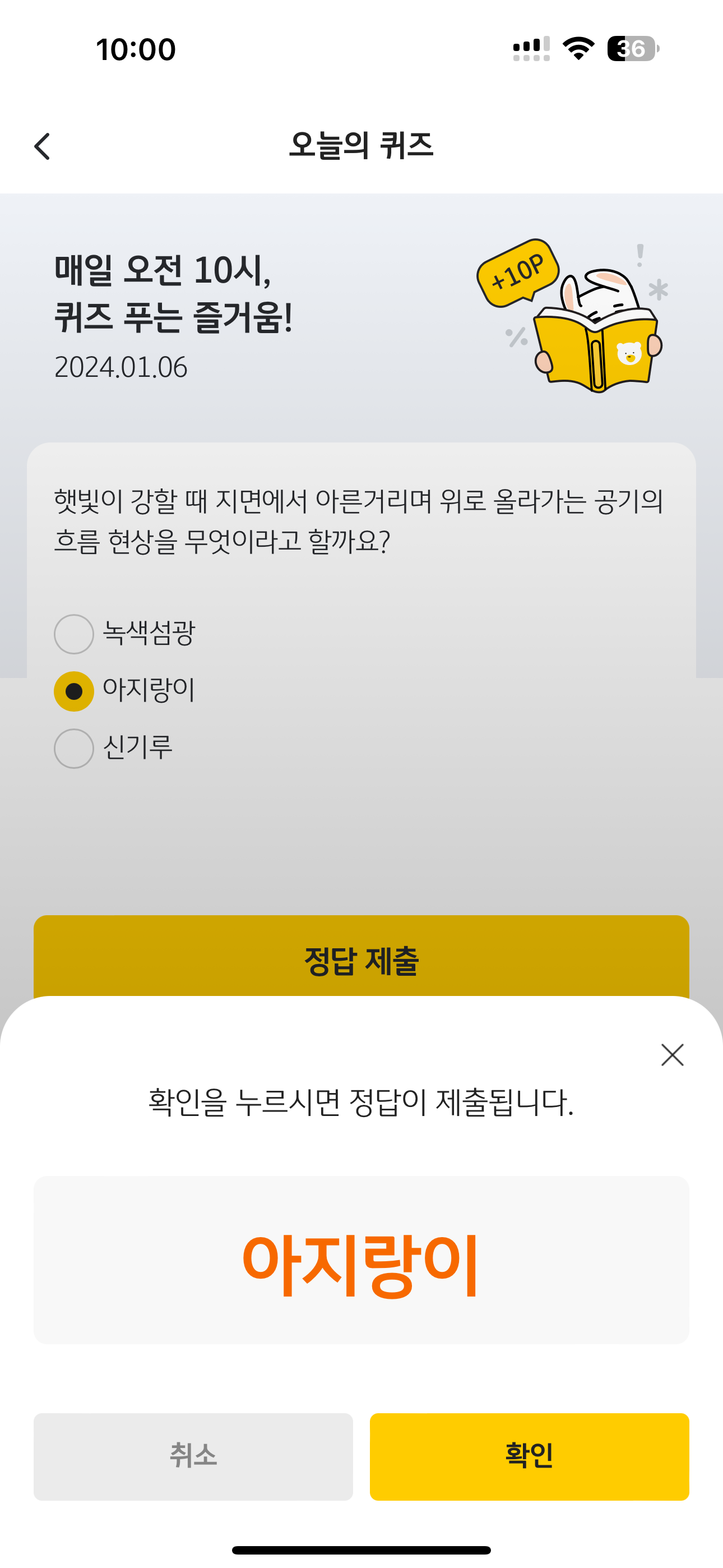 KB Pay 오늘의 퀴즈 1월 6일 정답(햇빛이 강할 때 지면에서 아른거리며 위로 올라가는 공기의 흐름 현상을 무엇이라고 할까요?)