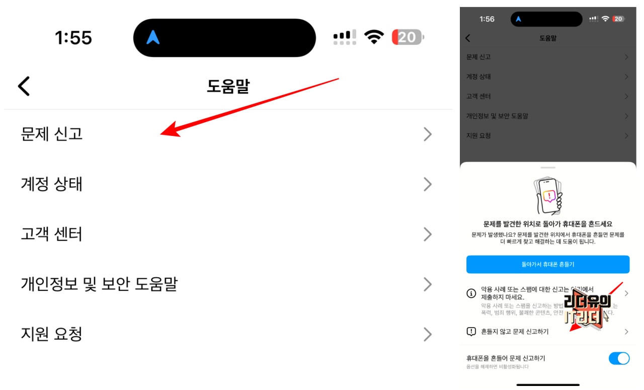 그냥 문제가 되는 페이지나 첫화면에서 스마트폰을 흔들어 보세요. 그럼 바로 해당 페이지가 캡쳐되면서 인스타그램 고객센터 메일을 보낼 수 있게 나옵니다. 아주 쉽게 할 수 있으니 해보세요