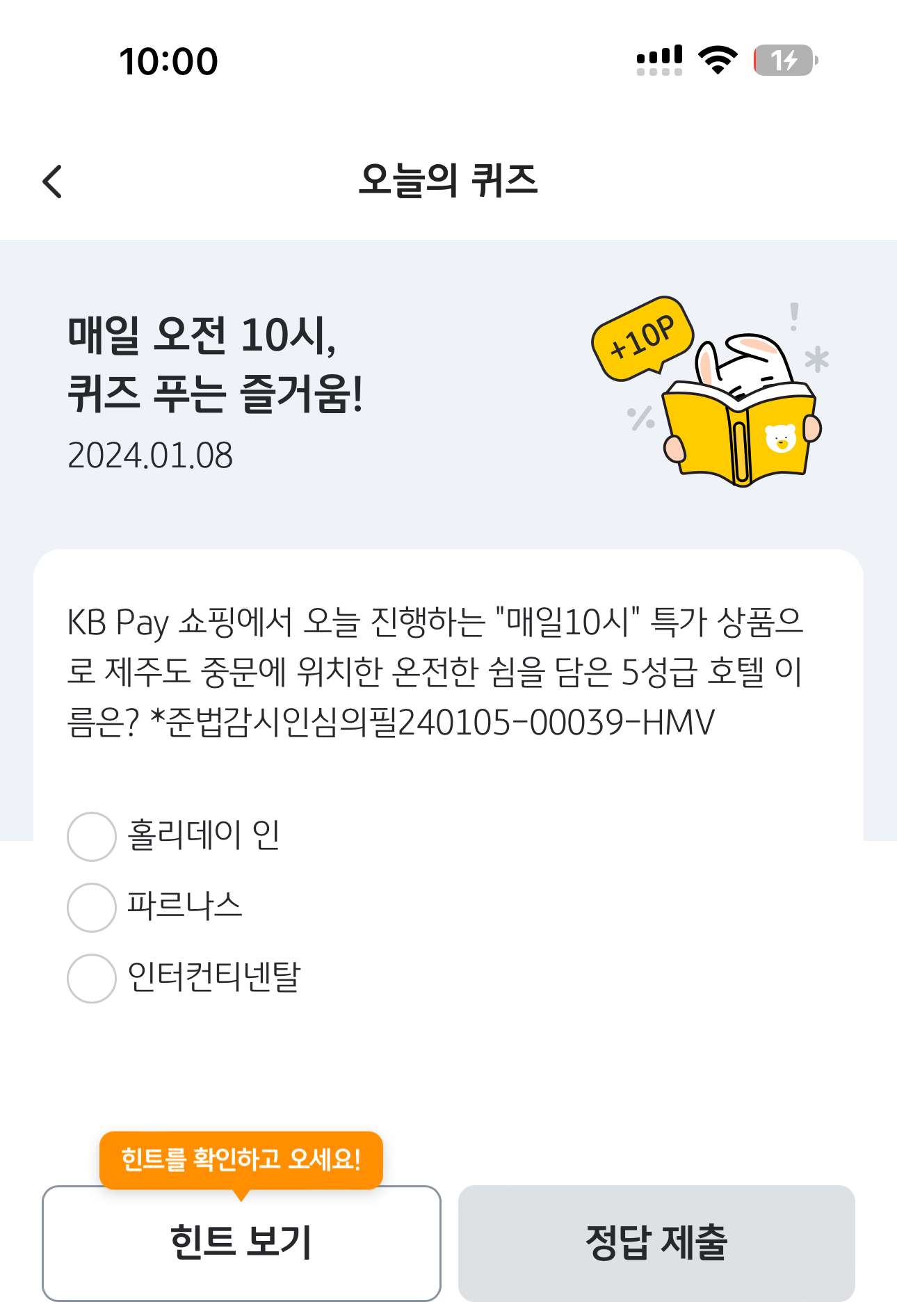 KB Pay 쇼핑에서 오늘 진행하는 "매일10시" 특가 상품으로 제주도 중문에 위치한 온전한 쉼을 담은 5성급 호텔 이름은? *준법감시인심의필240105-00039-HMV 보기는 1. 홀리데이 인 2. 파르나스 3. 인터컨티넨탈 요즘 특가 상품들이 꽤 잘 나오니 여행을 준비중이신 분들은 노려보세요