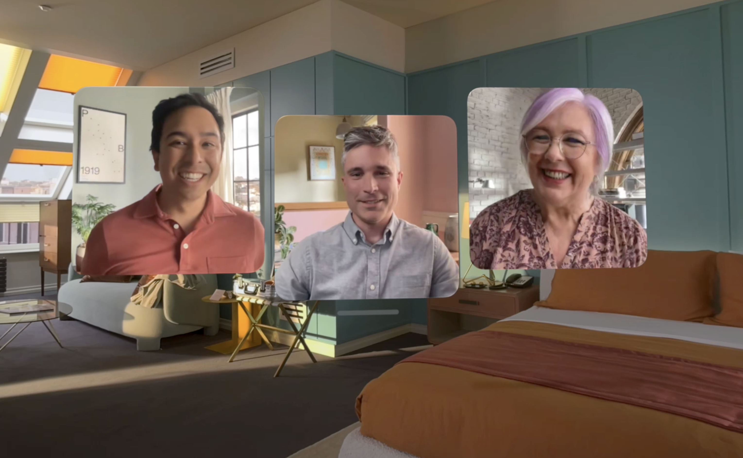 그리고 애플 기기들과의 호환성도 갖추고 있습니다. 애플 비전 프로를 장착한 상태에서 페이스타임 영상 통화가 가능합니다. 이 경우 자신의 얼굴을 보여줄 수 없으니 애플은 미리 얼굴을 스캔한 후, 사용자의 모델링인 '페르소나'를 대신 생성해 영상 통화를 자연스럽게 할 수 있게 준비했습니다. 그리고 맥북을 바라보는 것만으로 연결되어 맥북의 화면을 크게 볼 수 있습니다.
