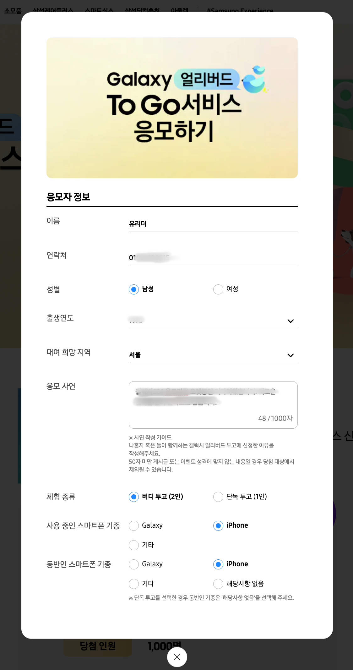 이름, 연락처, 대여 희망 지역 등을 선택하고 응모 사연을 적습니다. 그리고 이번에는 독특하게 버디 투고 (2인)이 생겼습니다. 둘이서 함께 빌릴 수 있는 서비스인데요. 함께 써볼 수 있어서 더욱 좋은 것 같습니다.