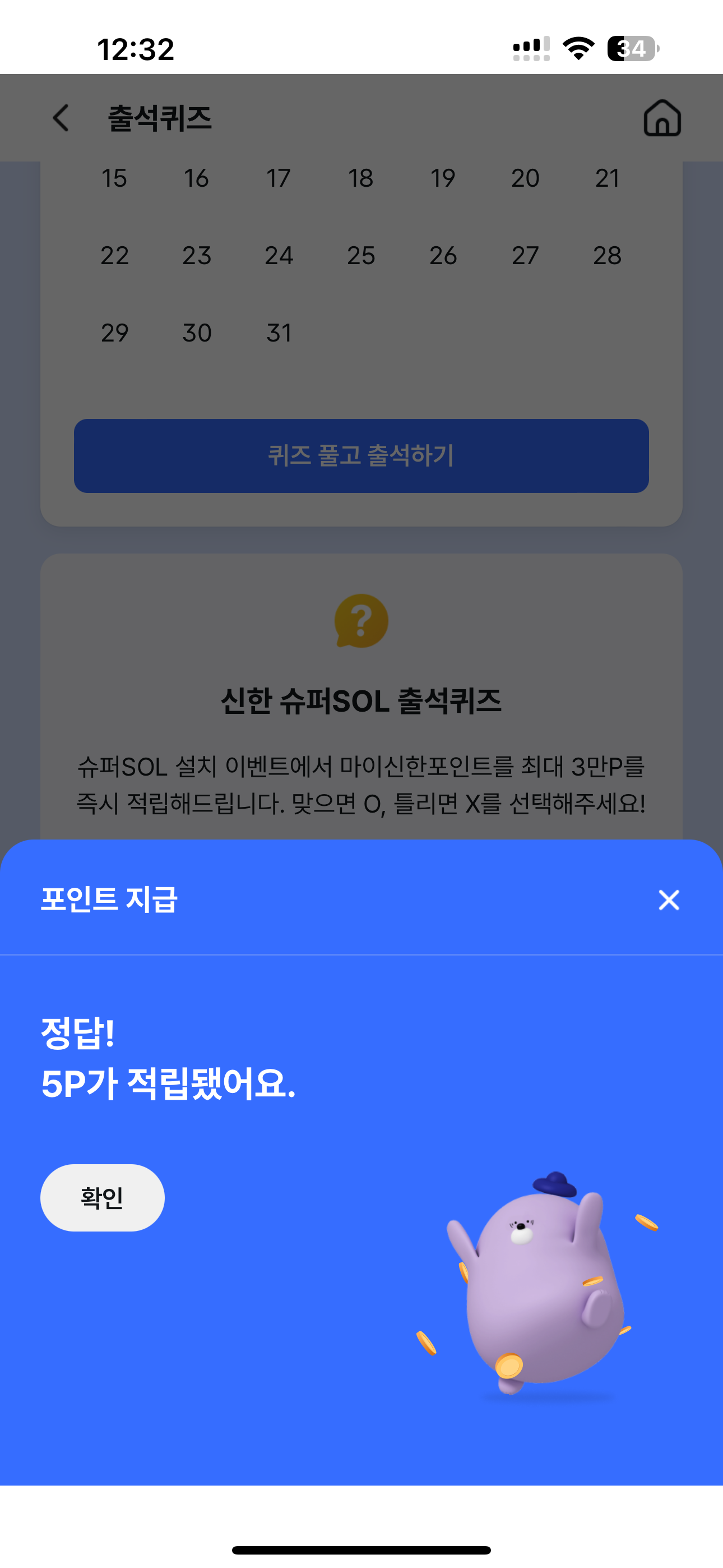 신한 슈퍼쏠 출석퀴즈는 매일매일 포인트를 받을 수 있으니 도전해 보세요