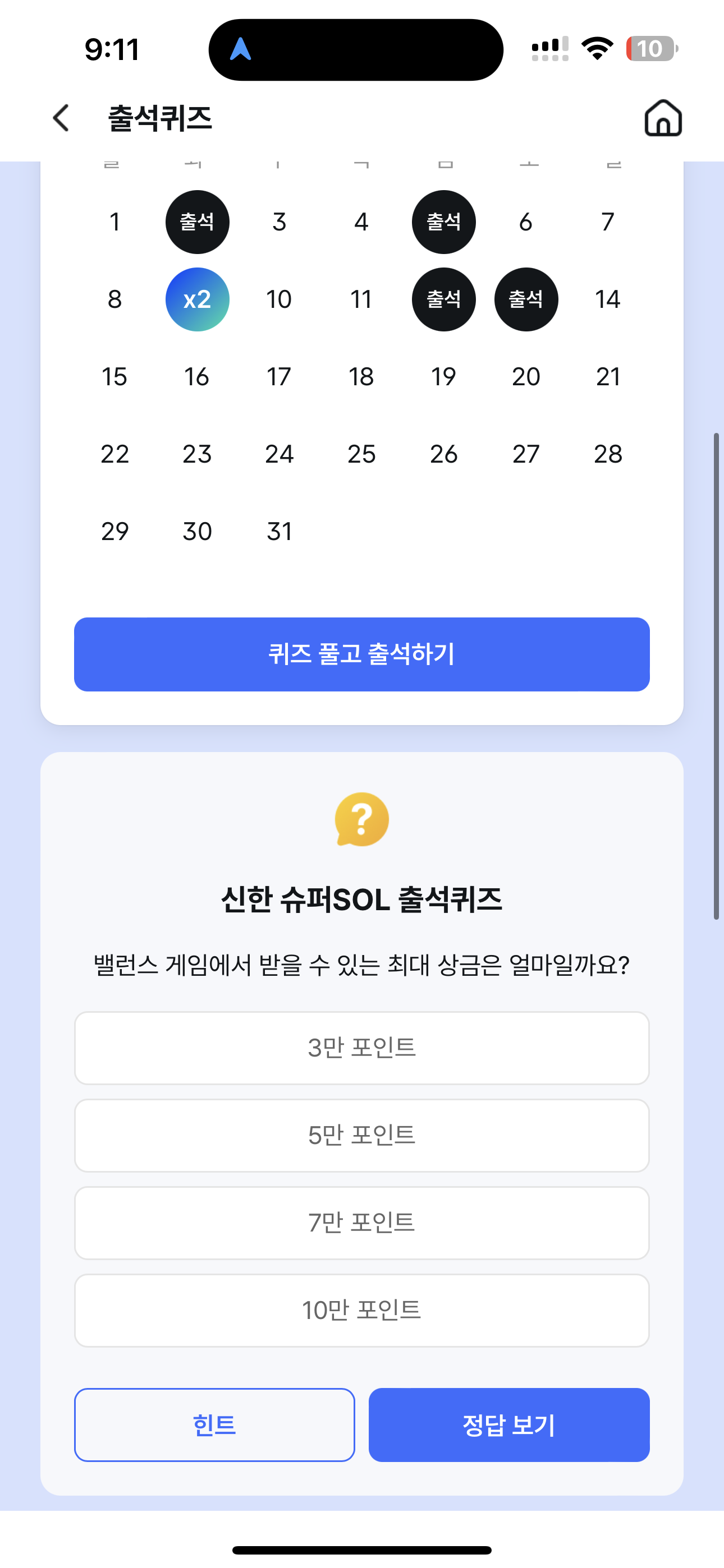 신한 슈퍼SOL 출석퀴즈 정답은 5만 포인트 입니다