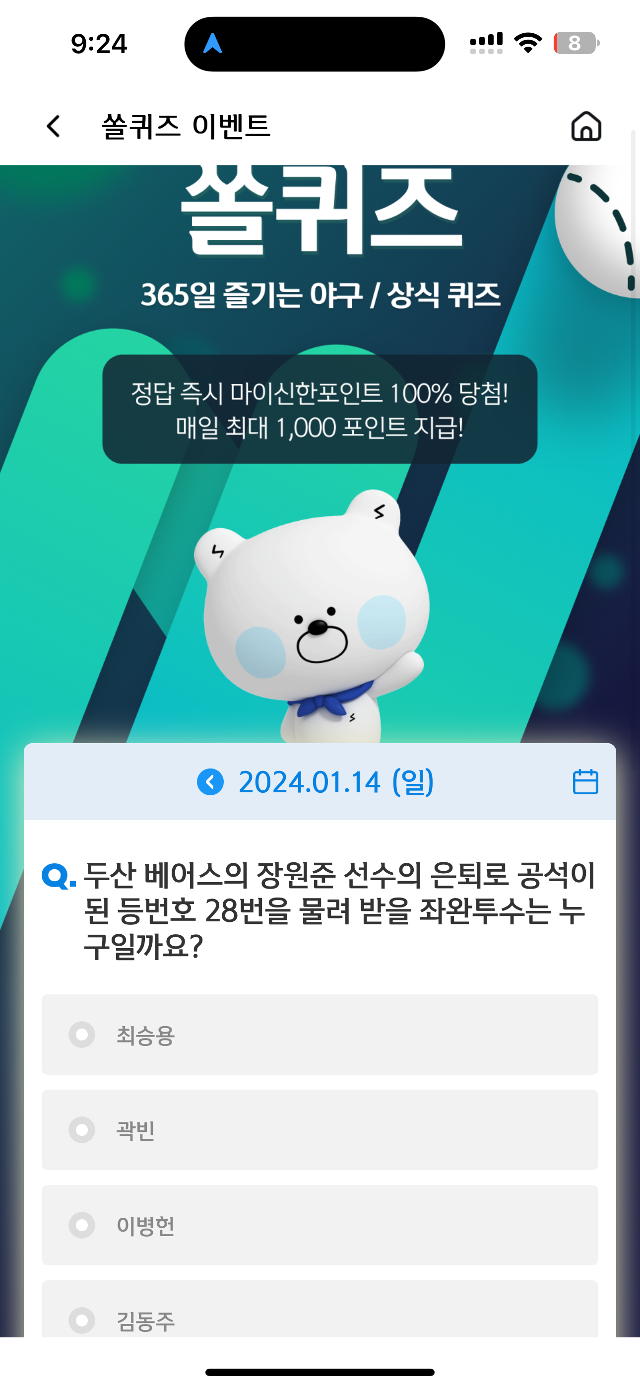 신한 슈퍼SOL 쏠야구 야구상식 쏠퀴즈 1월 14일 문제입니다