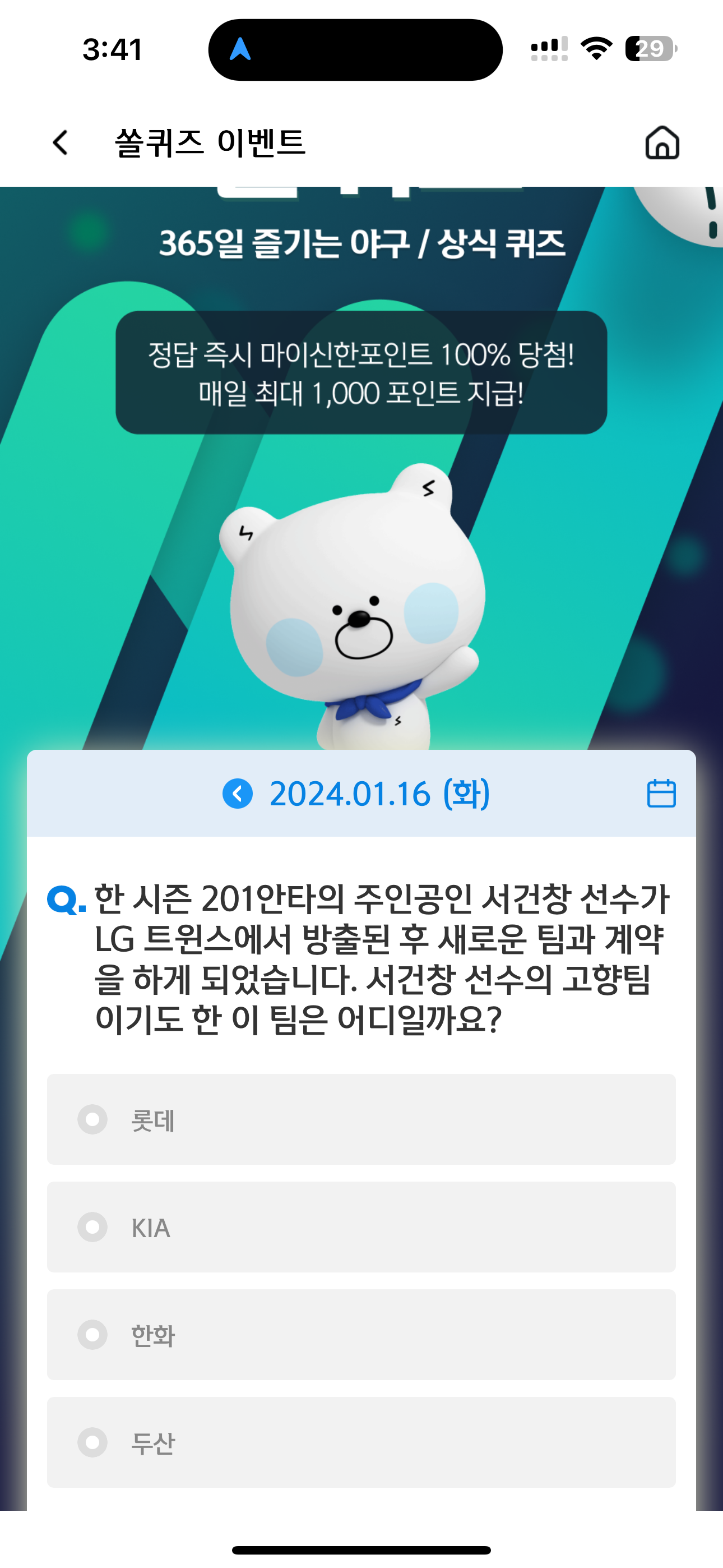 신한 슈퍼SOL 야구/상식 쏠퀴즈 1월 16일 문제입니다