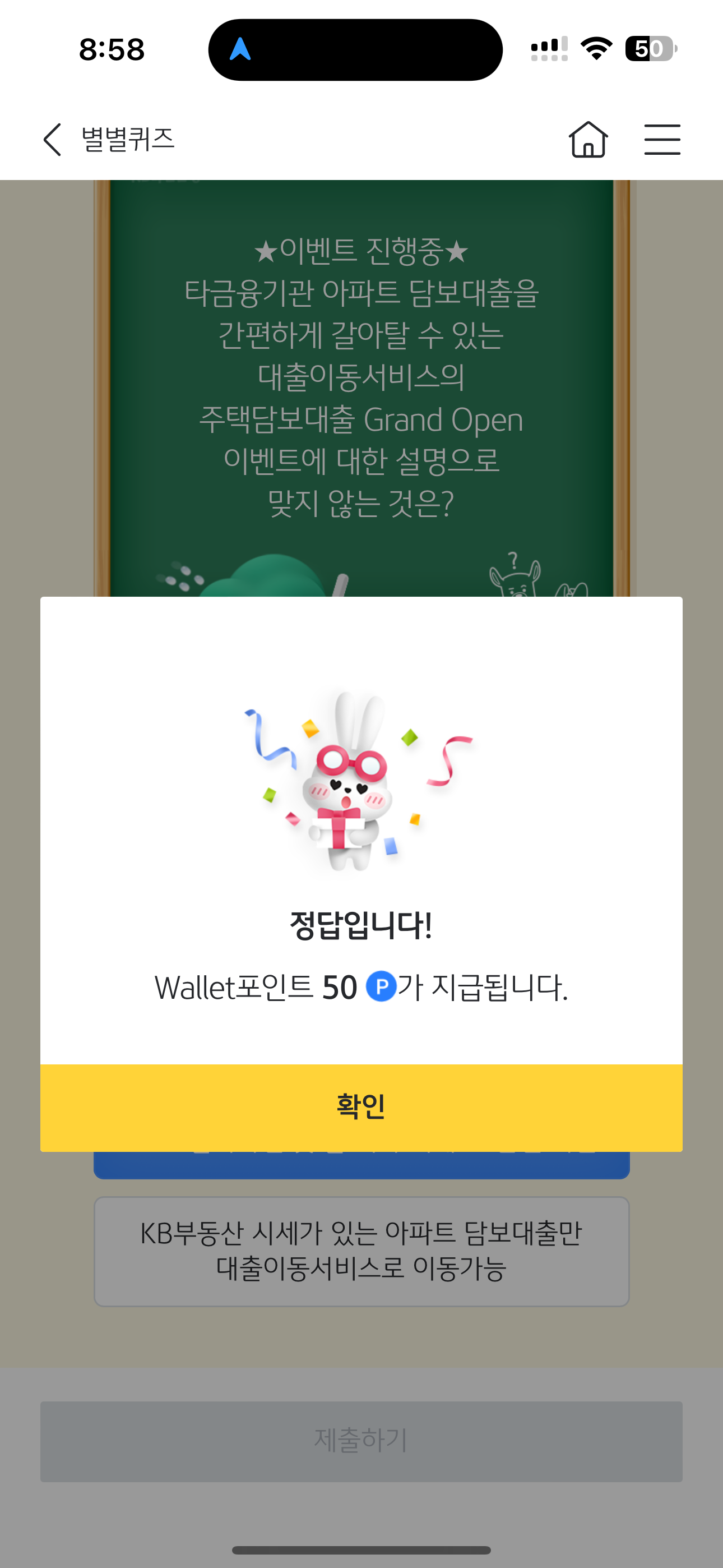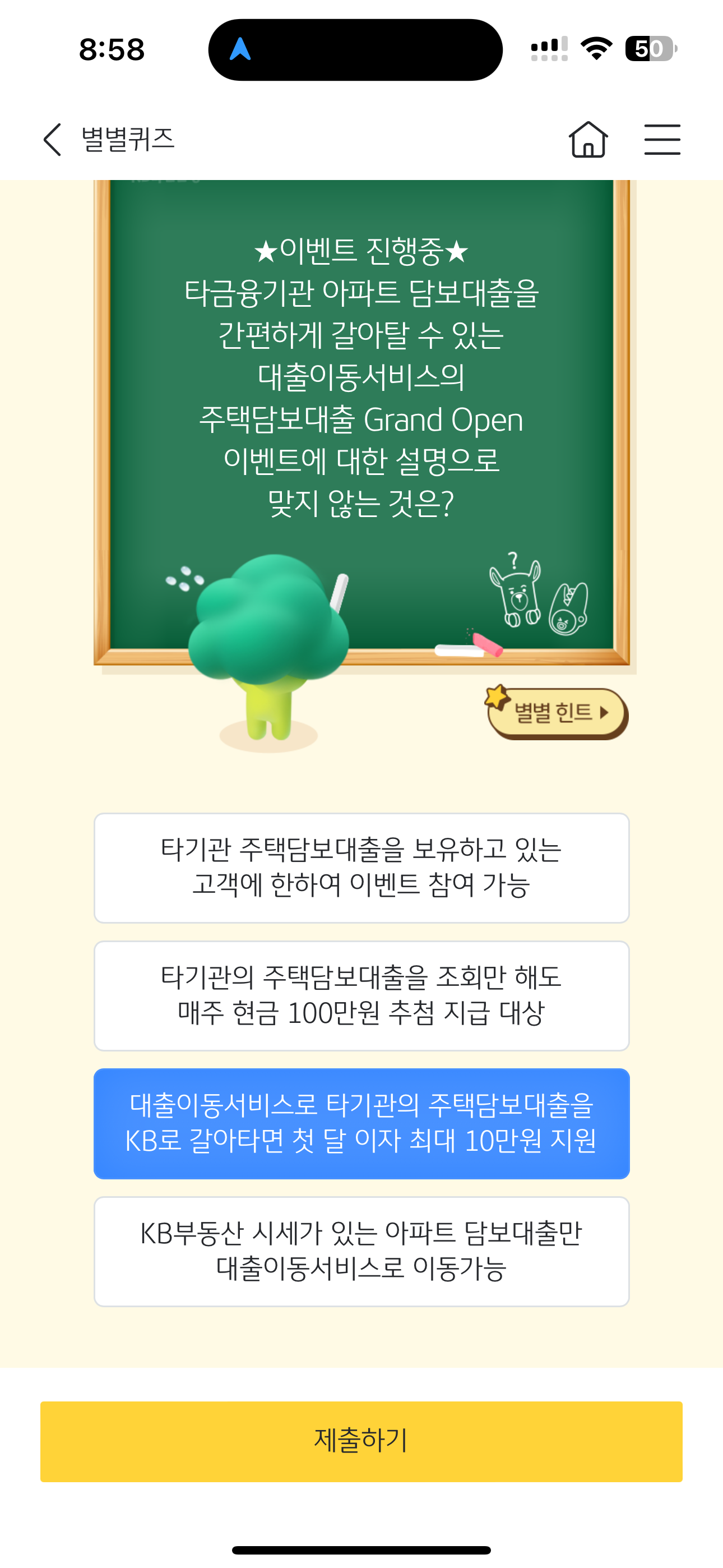 KB스타뱅킹 별별퀴즈 정답은 대출이동서비스로 타기관의 주택담보대출을 KB로 갈아타면 첫 달 이자 최대 10만원 지원 입니다