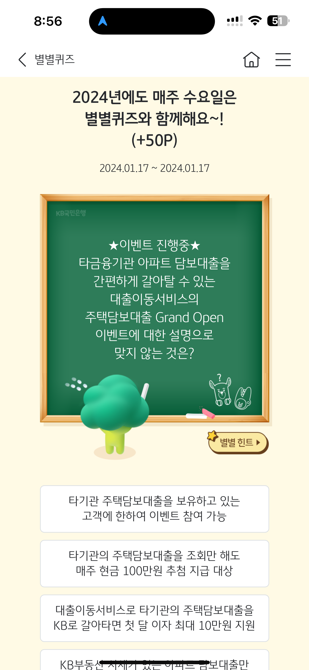 KB스타뱅킹 별별퀴즈 1월 17일 문제입니다