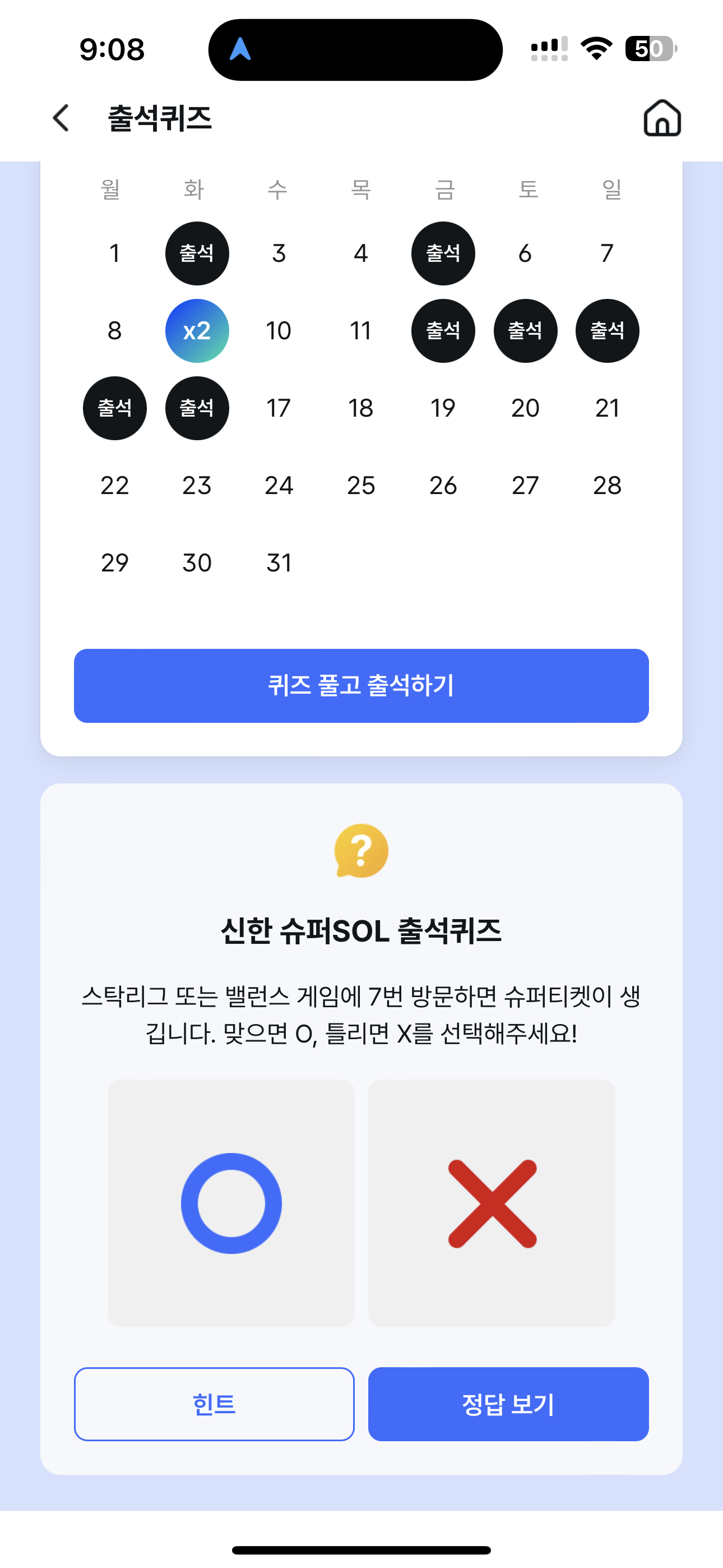 신한 슈퍼SOL 출석퀴즈 정답은 O 입니다