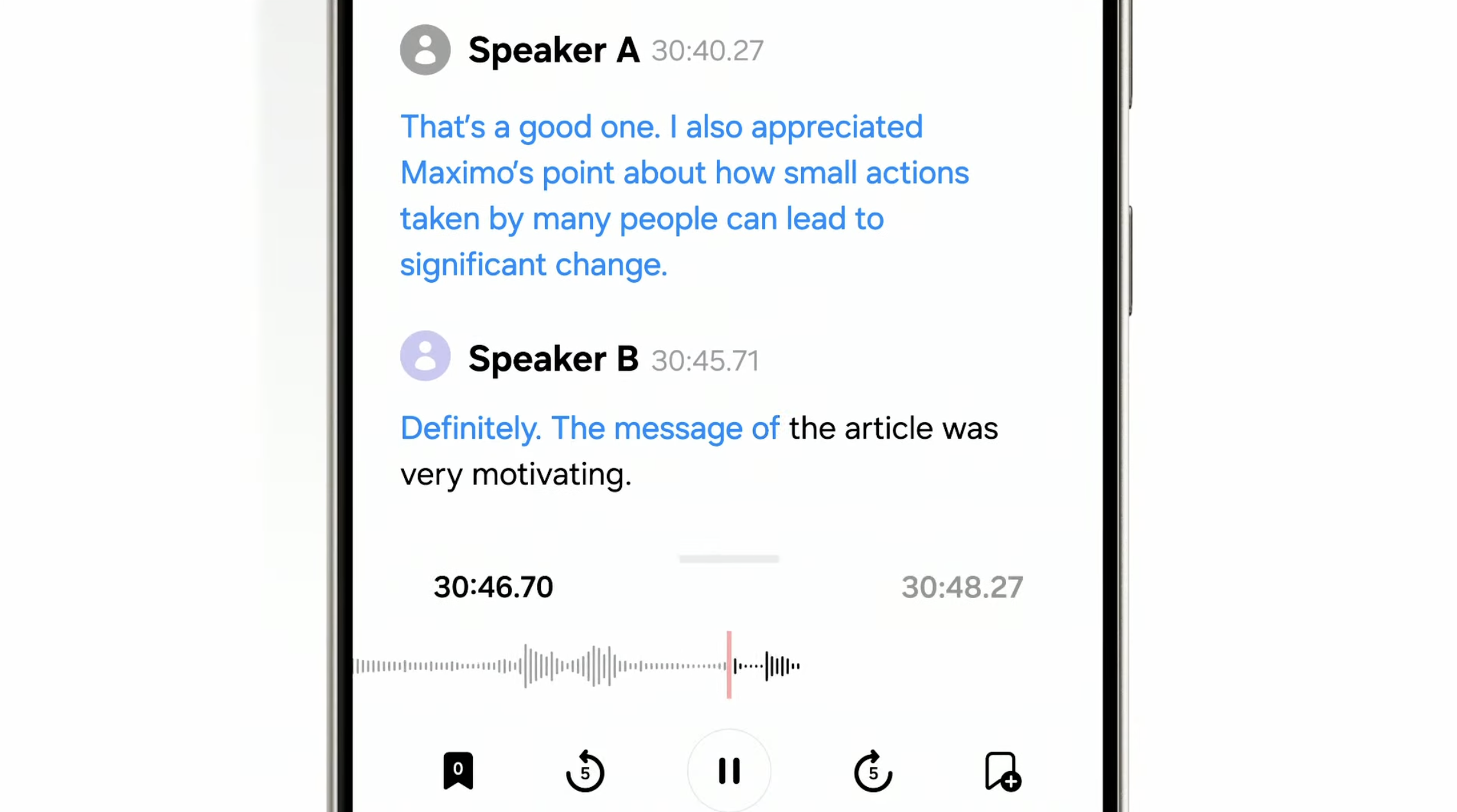 갤럭시S24, 갤럭시S24 플러스, 갤럭시S24 울트라는 음성 녹음 앱에서 회의나 강의를 녹음하면 STT(Speech-to-text) 기술을 활용해 A,B,C 등 최대 10명까지 발표자 별로 음성을 분리해 스크립트를 각각 제공해 주는 기능이 생겼습니다. 이렇게 정리된 스크립트는 요약하거나 번역을 할 수 있습니다.