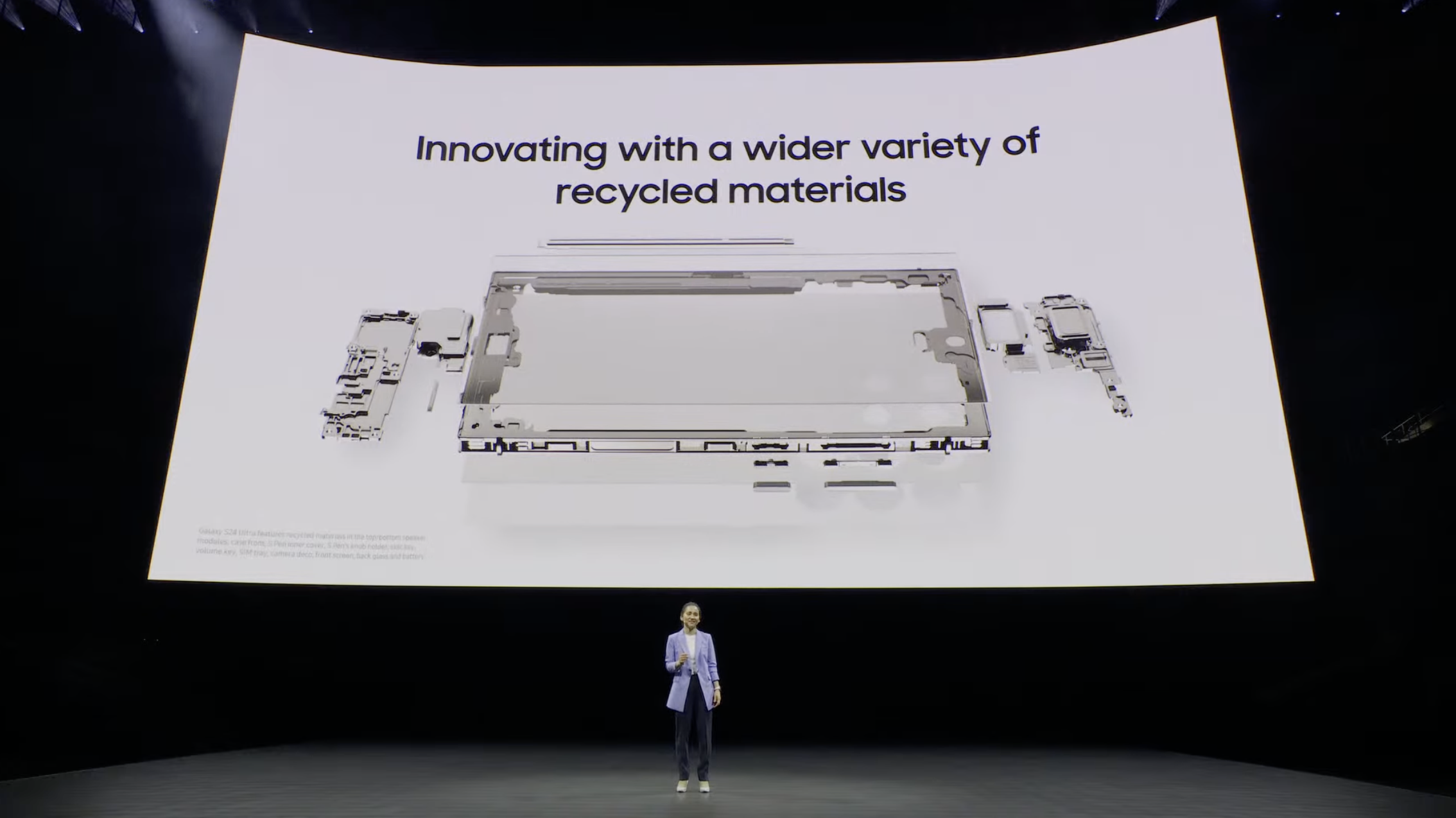 갤럭시S24, 갤럭시S24 플러스, 갤럭시S24 울트라는 전작보다 재활용 소재를 확대했습니다. 갤럭시S24 울트라와 갤럭시S24 플러스는 재활용 코발트 50%를 적용한 배터리를 사용했고 갤럭시S24 시리즈의 스피커에는 재활용 희토류가 100% 적용 되었습니다. 그리고 재활용 강철 40% 이상 사용되었고 재활용 TPU는 단말기의 사이드키와 볼륨키에 일부 적용됐습니다.