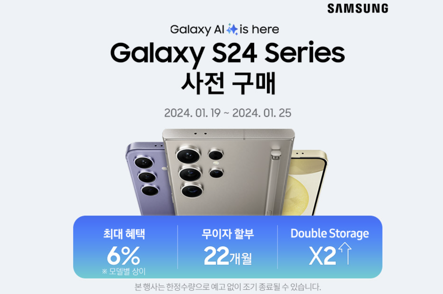 쿠팡 삼성 갤럭시S24 시리즈 사전예약 혜택은 최대 6% 할인 혜택, 무이자 할부 22개월, 저장공간 2배 혜택을 강조하고 있습니다.