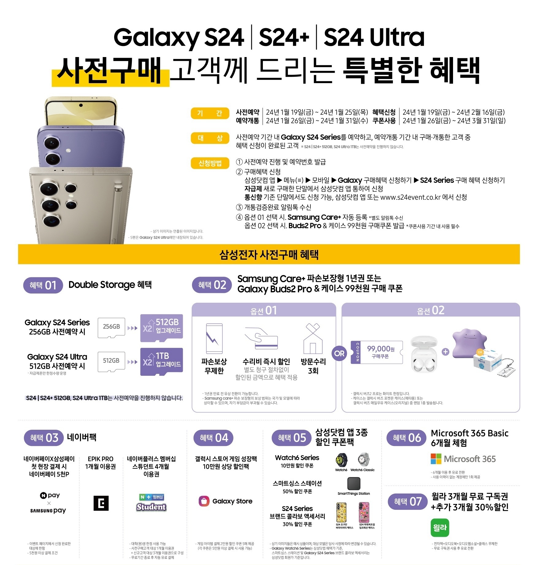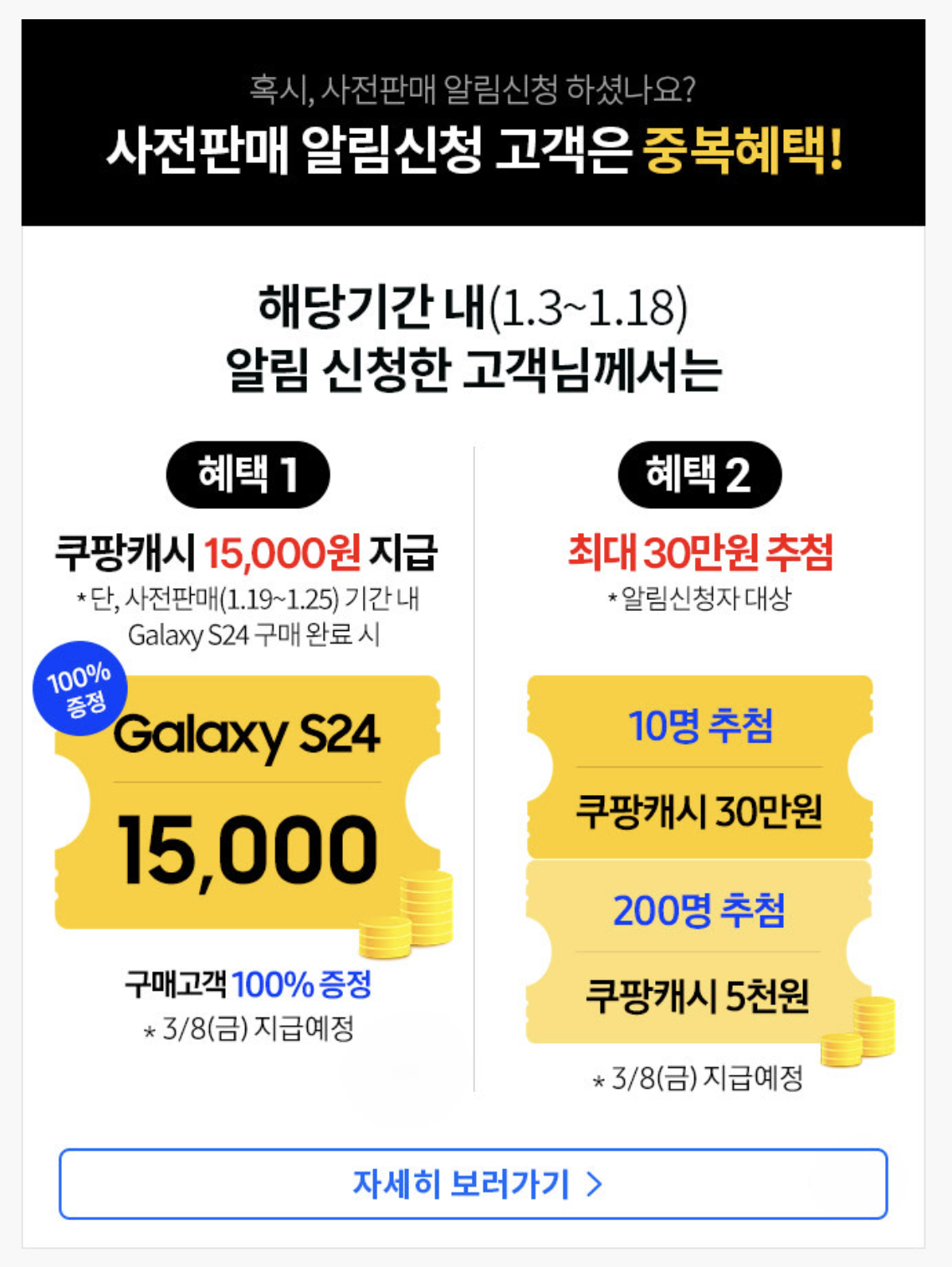 그리고 삼성에서 준비한 갤럭시S24 사전예약 혜택은 똑같이 적용 받습니다. 쿠팡으로 구입해도 똑같이 받는 서비스이니 참고해 두세요