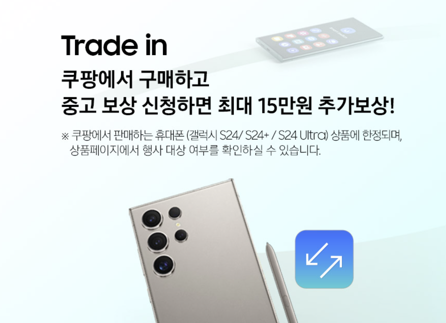 쿠팡은 트레이드 인으로 중고 보상을 최대 15만원 추가 보상을 해줍니다. 기본 책정된 가격에서 최대 15만원을 추가로 받을 수 있어 기존에 사용하던 폰이 있을 경우 활용하면 더욱 저렴하게 구입이 가능합니다.