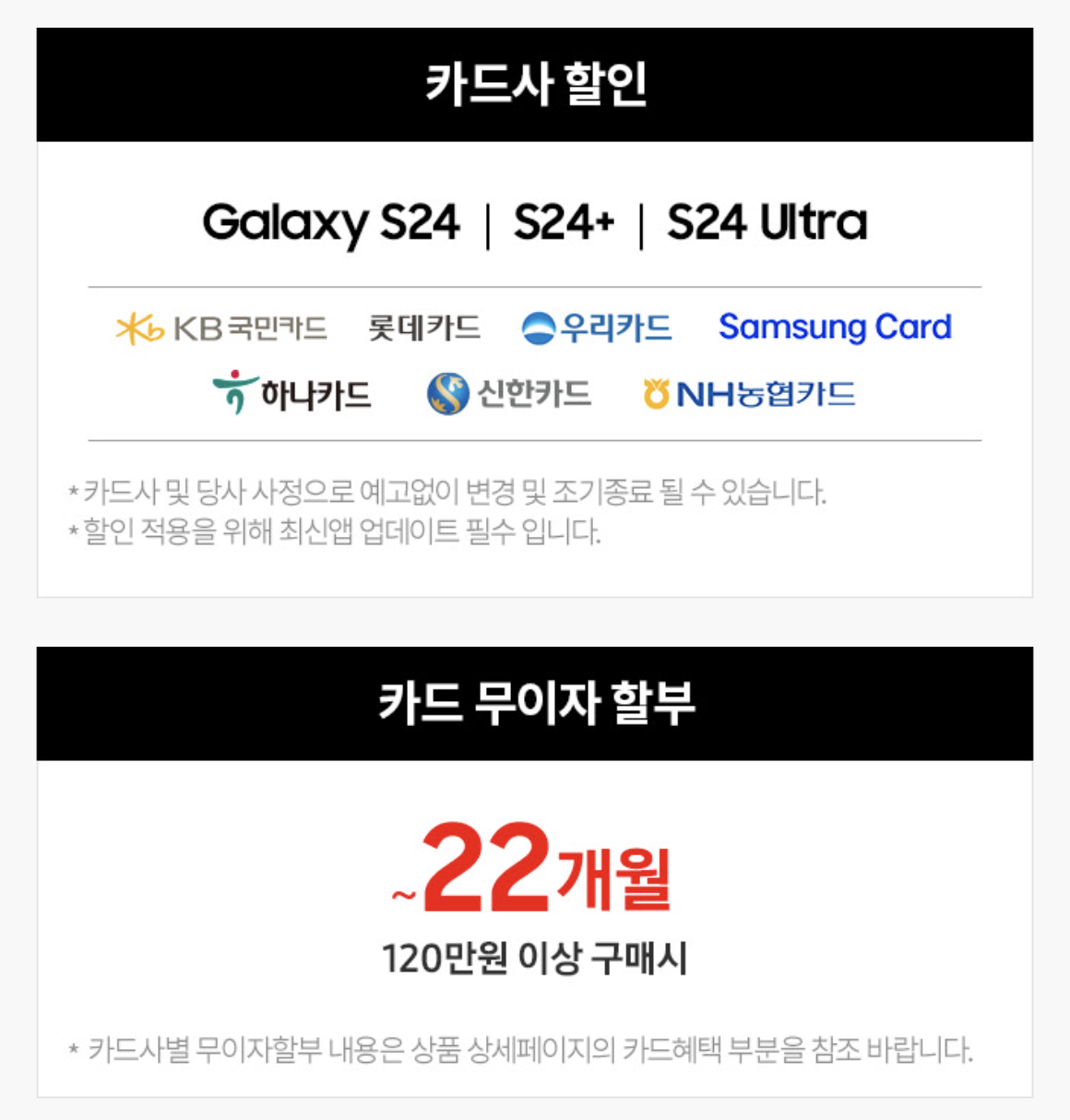 쿠팡 삼성 갤럭시S24 시리즈 가격 할인은 카드 할인으로 최대 6% 받을 수 있습니다. KB국민카드, 롯데카드, 우리카드, 삼성카드, 하나카드, 신한카드, 농협카드까지 대부분의 카드가 해당됩니다. 그리고 무이자 22개월 할부를 진행합니다. 요즘은 약정 걸고 사는 것보다 이렇게 무이자 할부를 이용해 나눠 내는게 훨씬 합리적입니다.