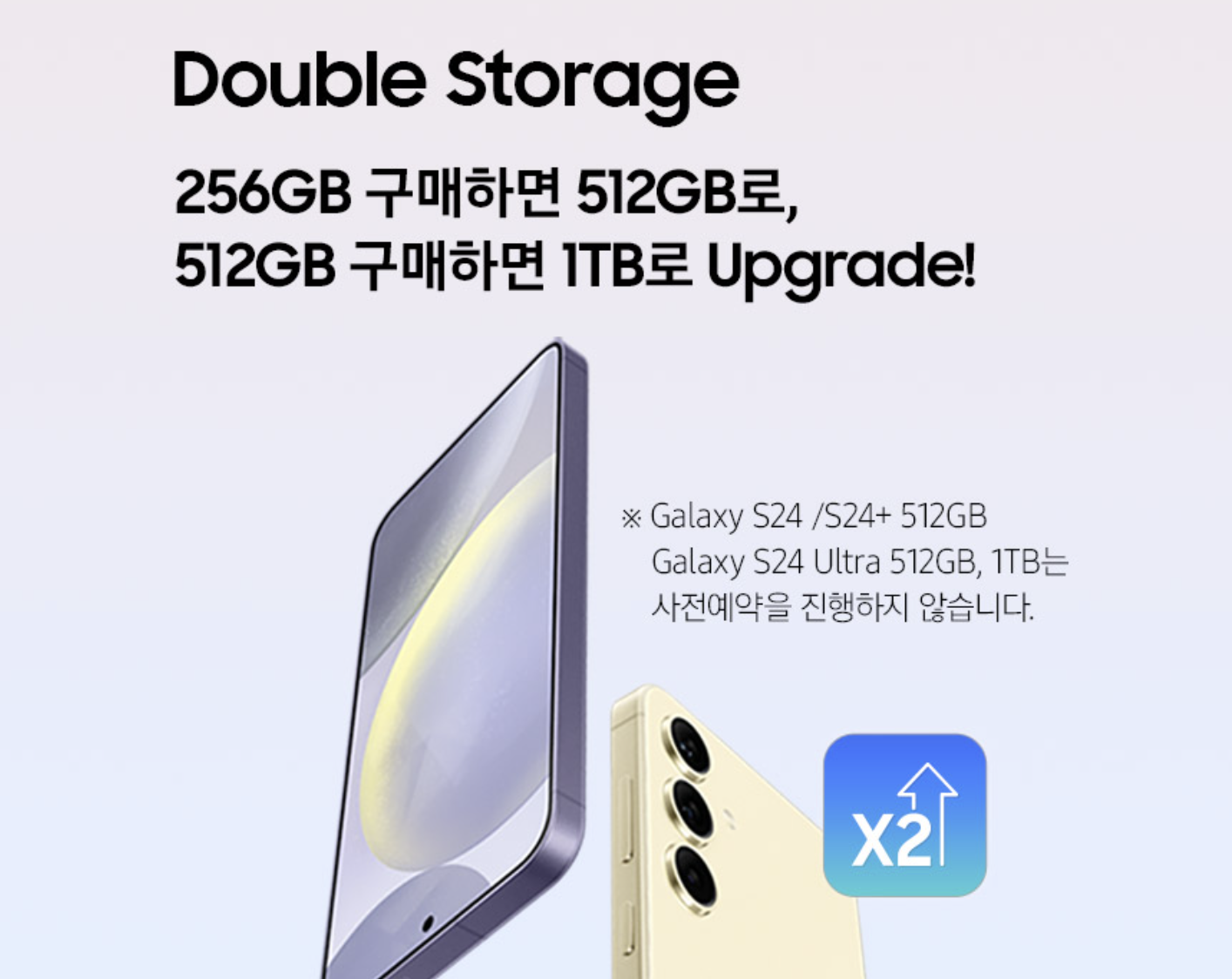 삼성 갤럭시S24, 갤럭시S24 플러스, 갤럭시S24 울트라 사전예약 혜택으로 저장공간을 2배로 업그레이드 해주는 혜택을 제공합니다. 저장공간은 많으면 많을수록 좋죠. 256GB 모델에 한해 지원하는 혜택이니 아주 매력적인 부분입니다.