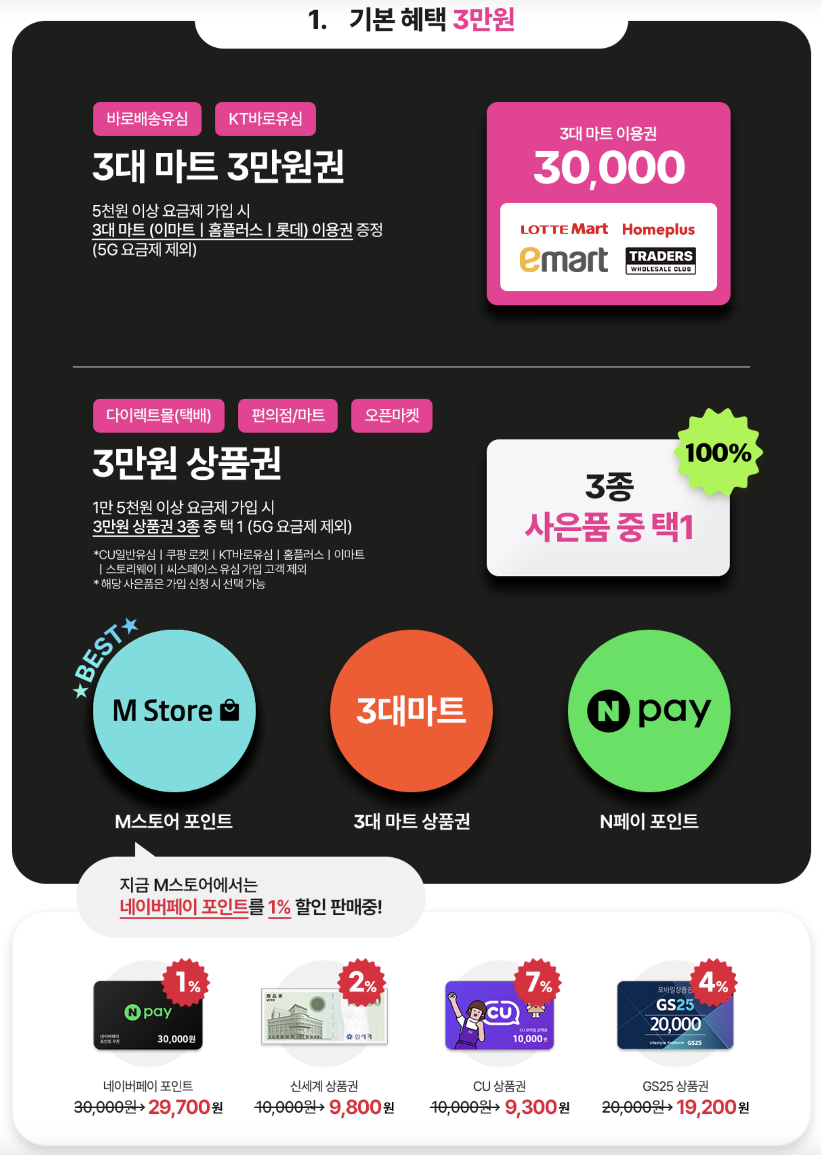 현재 진행중인 kt M모바일은 가입 혜택 입니다. kt M모바일 밀리의서재 요금제를 가입한다고 하면 1만 5천원 이상 요금제 가입 시 혜택으로 M스토어 포인트, 3대 마트 상품권, 네이버페이 포인트 중 하나를 선택해 3만원 상품권을 받을 수 있습니다. 전체 다 주는 것이니 꿀혜택입니다.