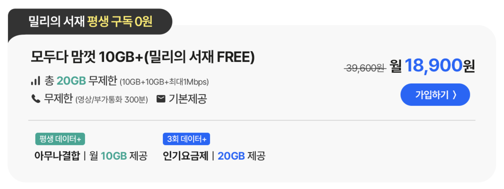 1만원대로 이용할 수 있는 요금제는 모두다 맘것 10GB+(밀리의 서재 FREE)도 있습니다.