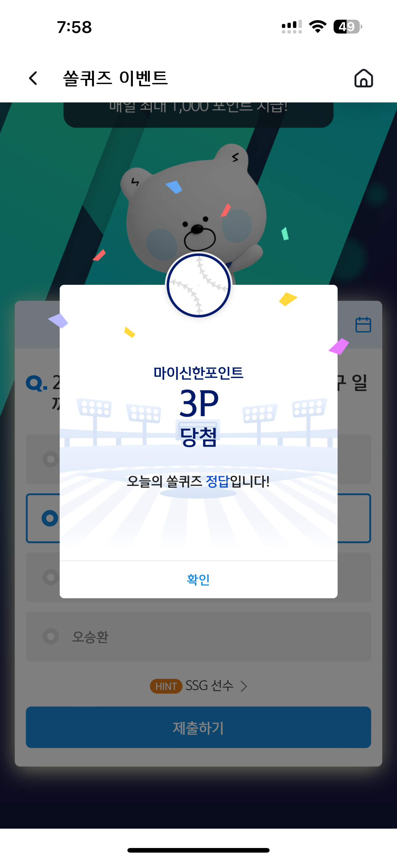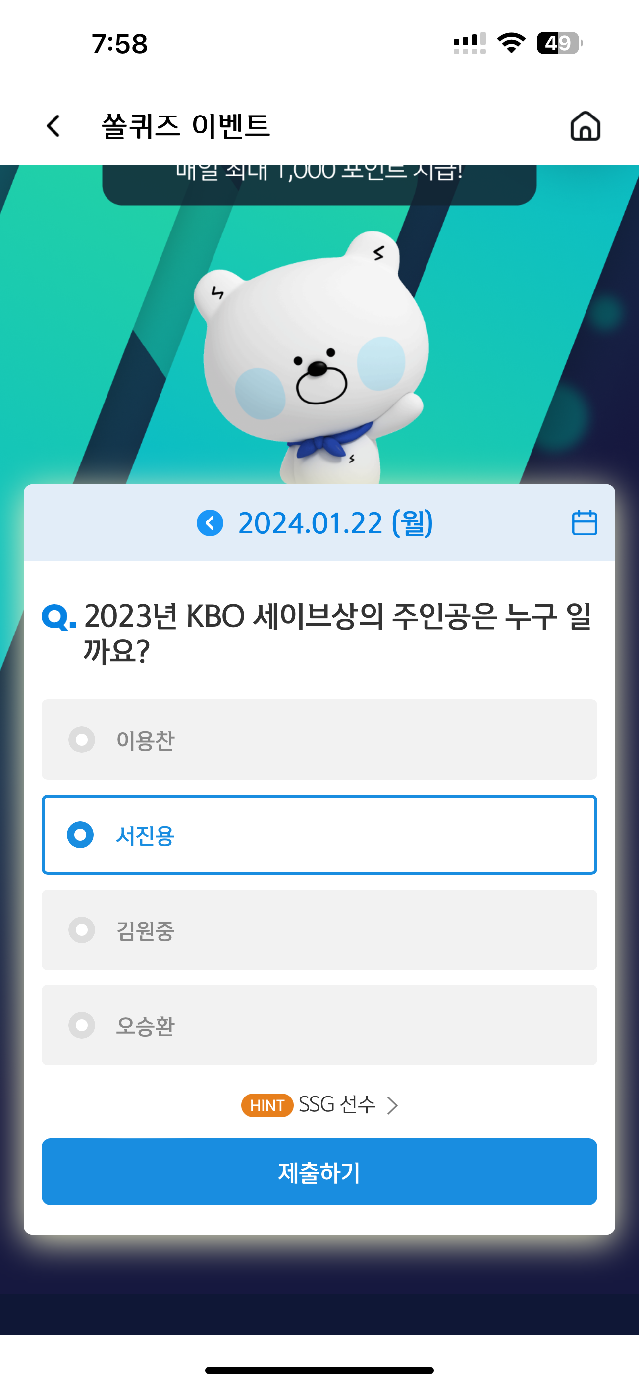 신한 슈퍼SOL 야구/상식 쏠퀴즈 정답은 서진용 입니다