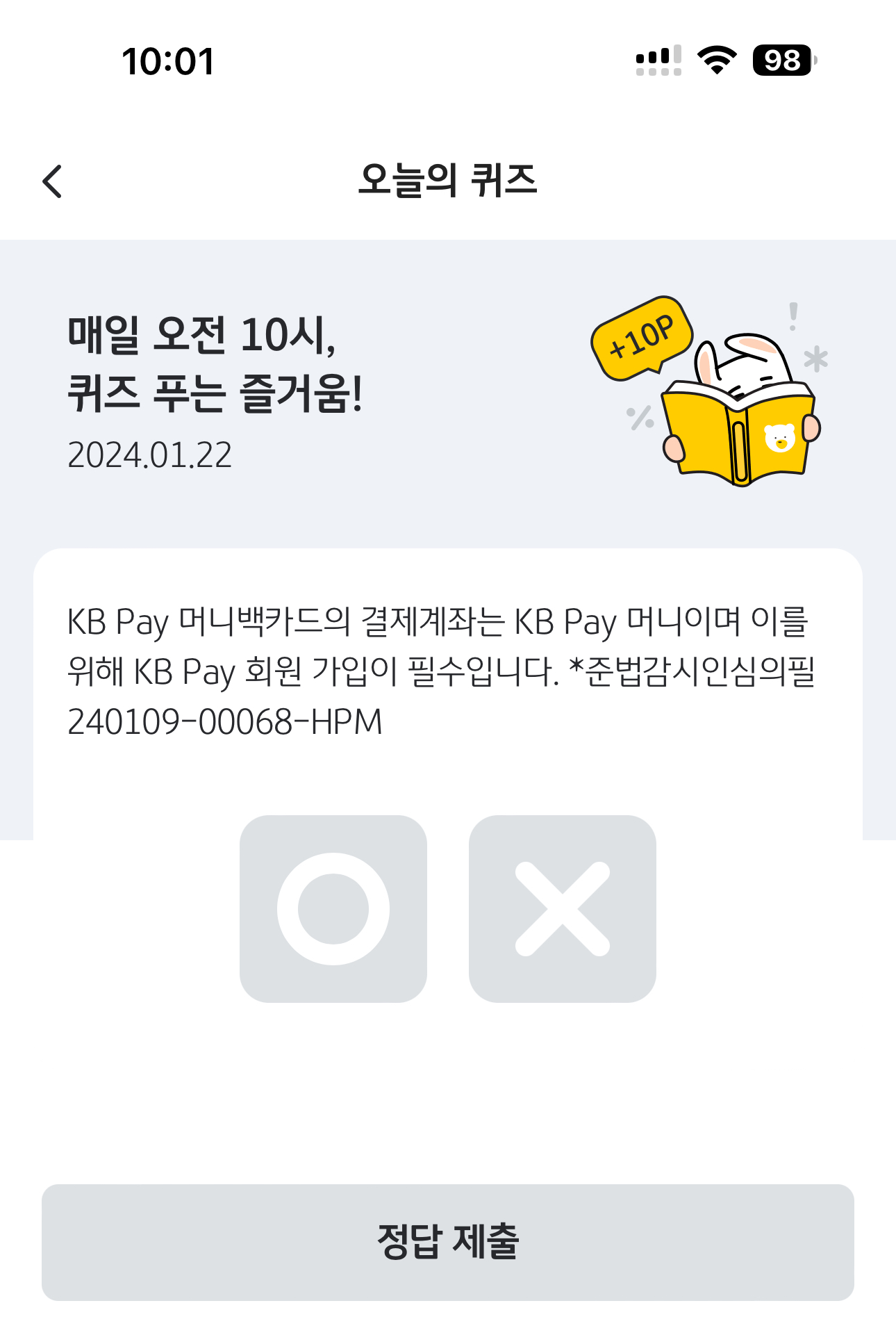 KB Pay 머니백카드의 결제계좌는 KB Pay 머니이며 이를 위해 KB Pay 회원 가입이 필수입니다. *준법감시인심의필 240109-00068-HPM O,X 퀴즈인데요.