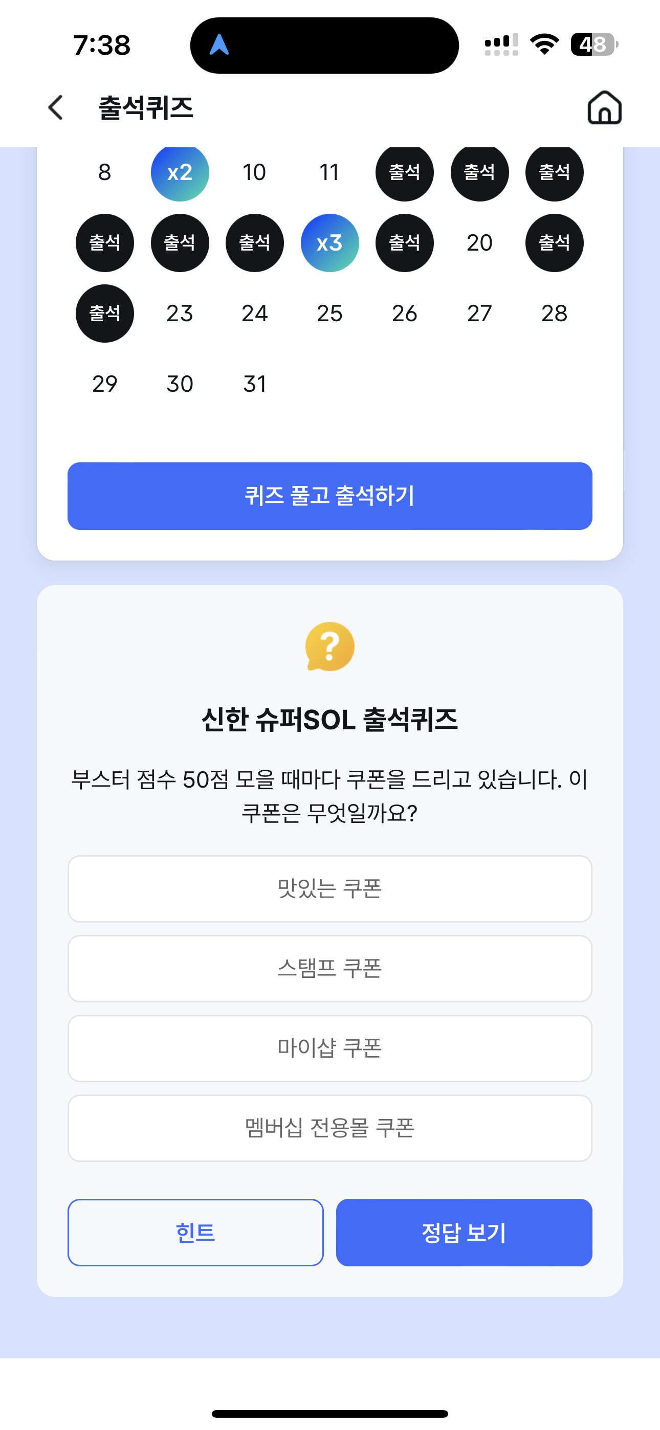 신한 슈퍼SOL 출석퀴즈 부스터 점수 50점 모을 때마다 쿠폰을 드리고 있습니다. 이 쿠폰은 무엇일까요? 보기는 1. 맛있는 쿠폰 2. 스탬프 쿠폰 3. 마이샵 쿠폰 4. 멤버십 전용몰 쿠폰 입니다. 오늘의 퀴즈 정답은 스탬프 쿠폰 입니다.